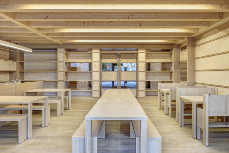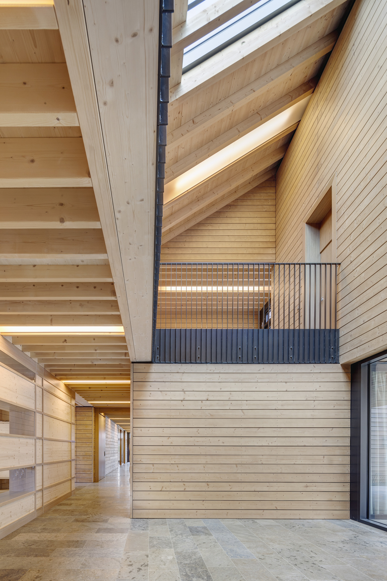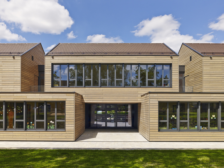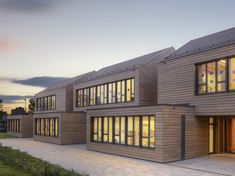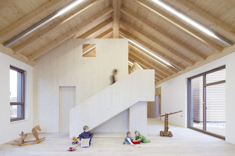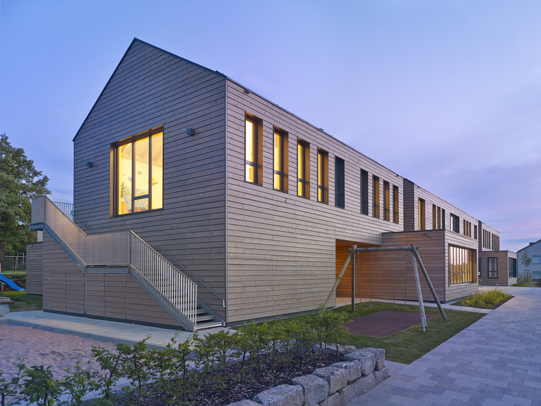 Das Erdgeschoss wurde in Massivbauweise errichtet, das Obergeschoss in Holzbauweise ausgeführt. Die Dächer wurden als freitragende Sparrenkonstruktion und die Wände in Holzständerbauweise erstellt. Durch diese Mischbauweise konnte Gewicht gespart, große Deckenspannweiten stützenfrei überbrückt und die Bauzeit optimiert werden. Die Typologie der traditionellen fränkischen Fachwerkhäuser diente als Inspiration. Die Außenhaut bildet eine horizontal gegliederte Holzschalung in lasierter Lärche. Die im Inneren konsequent fortgesetzte Holzverkleidung wirkt sich nicht nur positiv auf die Raumakustik aus, sie fördert auch die Kreativität der Kinder und wird als riesige Pinnwand genutzt. Warme, natürliche Materialien und Farben, Holz und Naturstein, wurden eingesetzt, um bewusst eine unaufgeregte Geborgenheit zu schaffen. Das Dorf wird lebendig durch die Kinder!
