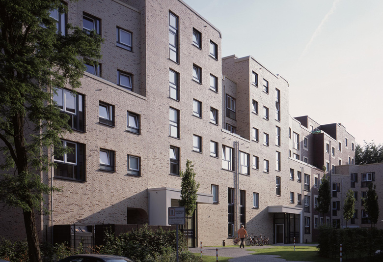 Projektwettbewerb 1.Preis: Auf dem Areal der ehemaligen Feuerwehrwache in der Behringstraße 42-44, ist ein generationsübergreifendes Wohnquartier entstanden. Die lebendige und einladende Atmosphäre wird durch das integrierte Stadtteilcafé harmonisch ergänzt. Das Erscheinungsbild der Umgebung wird geprägt von einer direkt gegenüber liegenden Blockrandbebauung, gebildet aus klar erkennbaren einzelnen Häusern. Die Bebauung findet in ihrer zusammenhängenden gestalterischen Sprache ihren Kontext, der gleichzeitig eine klar erkennbare Individualität in sich zum Ausdruck bringt. Dieses Thema nimmt die Neubebauung mit auf und interpretiert sie durch die Leitidee, dem Stadtteilcafé, das in dem Wohnquartier Begegnungsräume schafft und dadurch ein Gesamtensemble bildet. Jedes einzelne neu gebaute Haus wird sowohl Teil eines Ganzen, klar erkennbar und ablesbar mit eigener Individualität entwickelt. Hochwertig, jung und lebendig für alle Nutzer in allen Lebensjahren von 0 bis 110.
