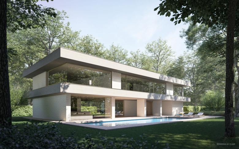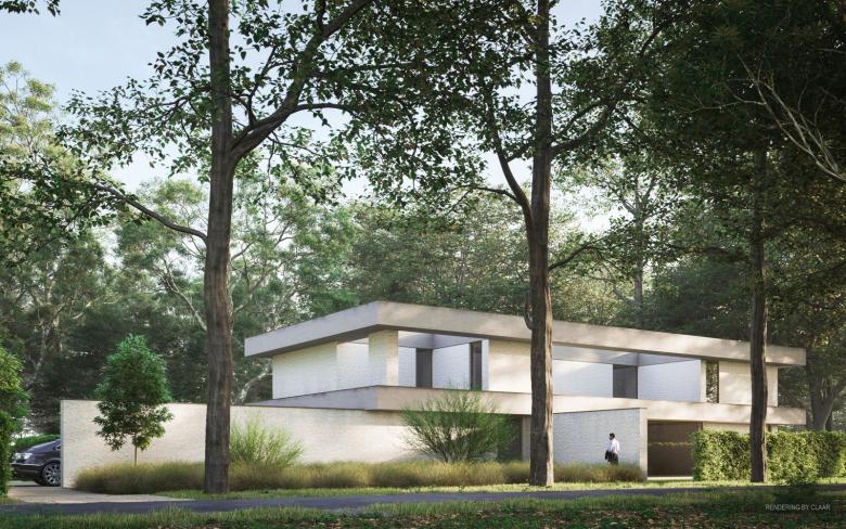 This strongly horizontal architectural design is paired with a strikingly vertical interior experience in the double-height living and TV areas. The concept is fully inspired by the wooded surroundings where the house is situated. A dramatic corner window on the upper floor of the living room and fully glazed bedroom walls ensure continuous visual contact with the trees. This connection creates a constantly changing experience throughout the year—from the intricate shadows of branches cast by the winter sun to the swaying canopy during a summer storm.