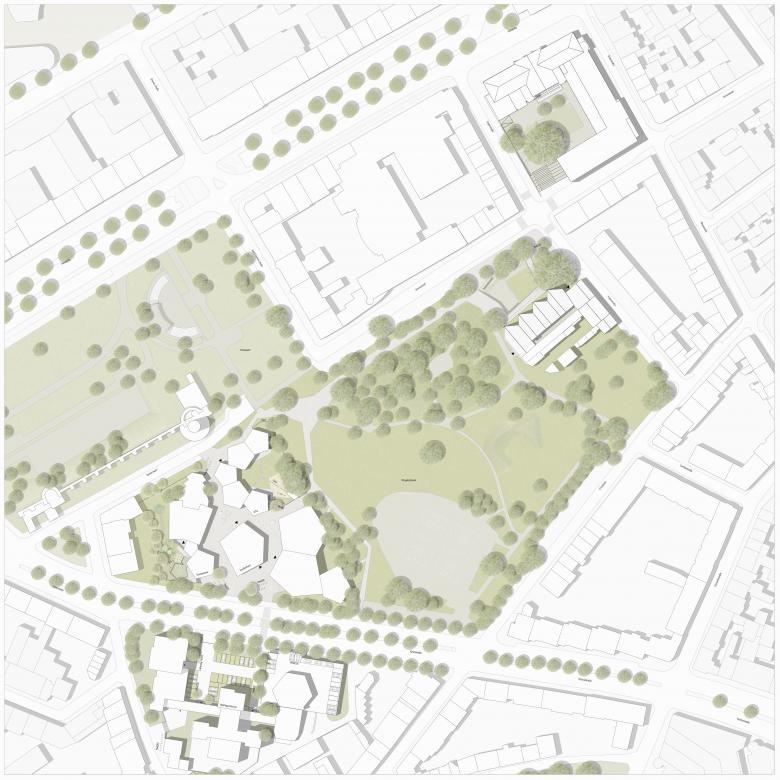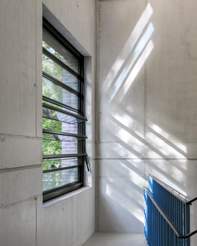 In Köln, an den Rändern eines innerstädtischen Parks, hat sich ein Zusammenbund verschiedenster Bildungseinrichtungen, die „Bildungslandschaft Altstadt Nord“ (BAN) etabliert. Neben den Bestandsinstitutionen Gymnasium und Abendgymnasium sowie Jugendbildungseinrichtungen, wurden fünf neue Bauten von gernot schulz : architektur realisiert: als letztes Puzzleteil ist nun das Mensa- und Ateliergebäude in Nutzung gegangen. Es steht als sog. Verbundgebäude wie auch das Studienhaus sämtlichen Institutionen der BAN zur Verfügung. Das „Mensa- und Ateliergebäude“ (MAG) greift die Materialität und polygonale Formensprache der Gebäude vis-à-vis des Parks auf. Durch sich wiederholende Nischen und Raumaufteilungen erhalten die Gemeinschaftsräume des MAG immer neue Lern-, Aufenthalts und Identifikationsräume. Die inzwischen acht beteiligten Institutionen der Bildungslandschaft ermöglichen aufgrund der hohen Nutzerzahl in der Mensa die Einrichtung einer sogenannte Frischküche. Ein Team von Köchen und Köchinnen kann bis zu 1000 Essen am Tag, zeitlich gestaffelt vom Kindergarten bis zum Abendgymnasium, frisch kochen und ausgeben. Durch die fächerartige Architektur werden Raumkompartimente ausgebildet die den typischen anonymen Großraum vermeiden und zudem bei Bedarf das Trennen verschiedener Nutzergruppen möglich macht. Ein durchdachtes Ausgabesystem ermöglicht eine schnelle Austeilung und Abgabe gebrauchter Tabletts. Im ersten Obergeschoss befindet sich das Selbstlernzentrum der Lernenden und das Schülercafé unter der Leitung des Caterers. Der Raum ist bewußt offen gestaltet und nur mit losem Mobiliar bestückt. Er steht allen Beteiligten der verschiedenen Einrichtungen ob Lehrer, Eltern oder Kindern zur Verfügung. Im Dachgeschoss erweitern die Atelierräume das Bildungsangebot der BAN. Es gibt je ein Atelier für Tanz, Schauspiel, Handarbeit und Kochen. Dabei sind auch hier die Räume weitestgehend von Möblierung frei gehalten worden, um Raum für Ideen und Entfaltung zu geben. Das Tanzatelier erhielt dabei einen Holzschwingboden, Spiegel und Ballettstange, der Schauspielraum eine kleine