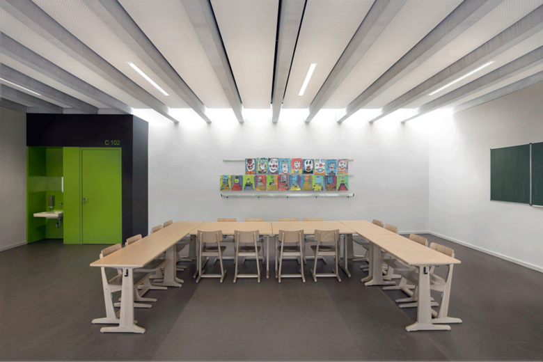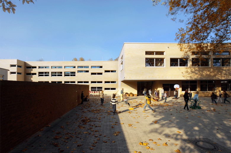 Der für den Erweiterungsbau der Gemeinschaftsgrundschule zur Verfügung stehende Bauplatz befindet sich auf dem Grundstück einer vorhandenen Schulsporthalle, welche dem bestehenden Schulbau gegenüber liegt. Im Norden des Grundstücks schließt eine großzügige, städtische Festwiese an, welche den Blick auf die Matthiaskirche freigibt. Eine alte Platane hinter der bestehenden Sporthalle markiert den Zugang und wird Ausgangspunkt des Entwurfskonzepts. Ziel des Entwurfes ist es, im Dialog mit dem bestehenden Klinkerbau der Sporthalle rund um die alte Platane ein Ensemble zu schaffen, welches den bestehenden verborgenen Hinterhof in eine kleine urbane Situation aus Straßen, Räumen und Plätzen überführt. Der Neubau ist janusköpfig. Nach Norden wird eine präzise Raumkante gesetzt, welche den Rand der Festwiese markiert. Ein einziger Einschnitt im Volumen markiert die Sichtbeziehung zum Kirchturm vis-à-vis. Nach Süden ist der Baukörper skulptural geformt. Vor-, Rücksprünge und Auskragung markieren Platzraum und Eingang. Die Materialgleichheit aller Flächen unterstützt die Skulpturalität des Baukörpers. Die Idee des „Verborgenes sichtbar Machens“ wird mit dem gelben Klinker fortgeführt. Es zitiert die Materialisierung des Inneren der Sporthalle. Dem Bild der kleinen Stadt entsprechend werden Qualitäten somit erst beim genauen Hinsehen und/oder Bewohnen sichtbar. Besucher und Nutzer des Neubaus werden zunächst durch die kleine Eingangshalle aufgenommen, von welcher aus sie sich in die einzelnen Räume und Geschosse verteilen. Der gesamte OGTS Bereich mit Betreuungsräumen und Speisesaal, sowie die zugeordneten Funktionsräume befinden sich im Erdgeschoss, zusätzlich oberbelichtete Klassenräume und Lehrerzimmer sind im Obergeschoss untergebracht. Alle Wandflächen der Wege und Gemeinschaftsräume sind ebenfalls aus gelben Klinker erstellt. Lediglich die Klassenräume sind auf Wunsch der Nutzer „neutral“ weiss verputzt. Farbige Kuben markieren jeweils die Klassenzugänge. In den Treppenräumen wird durch die Verwendung des Klinkers auch als Bodenbelag ein Spiel aus Material, Licht und Bewegung provoziert und somit das Haus auch zur Architektur-Schule.