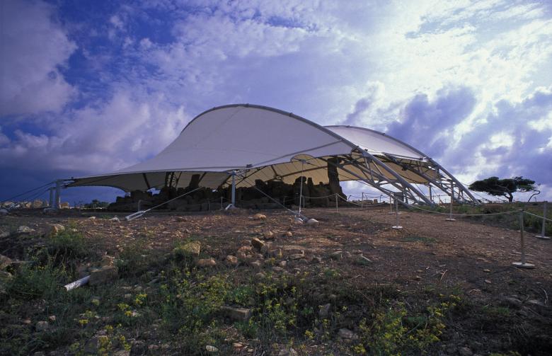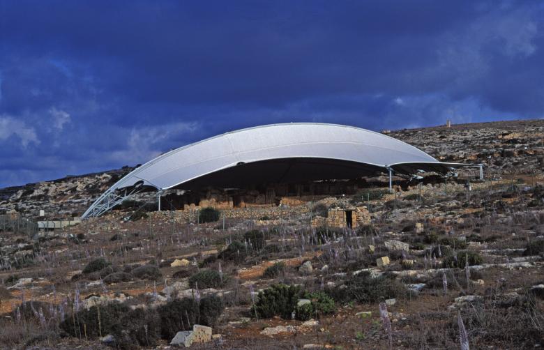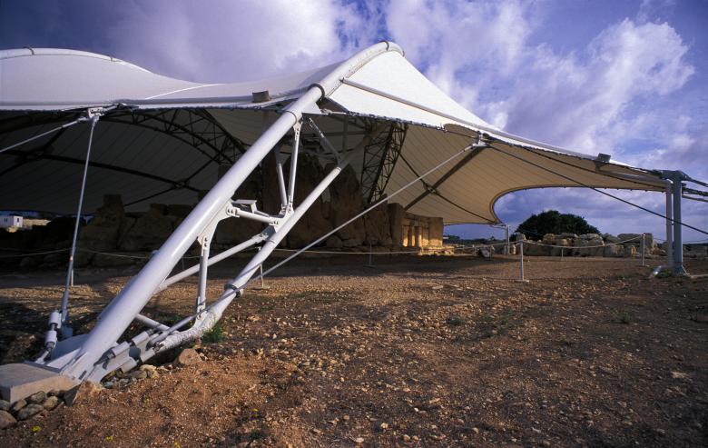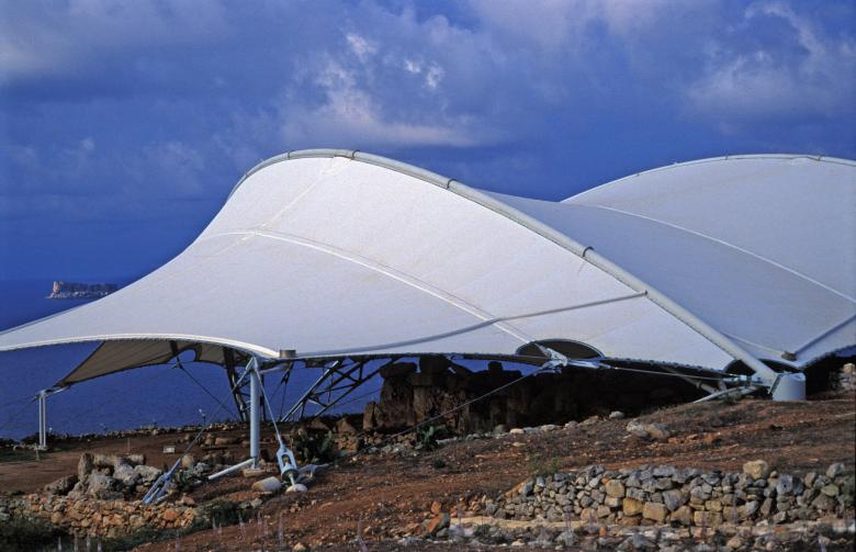Die zwei Spann-Membranstrukturen für die beiden über 3000 Jahre alten und zum Unesco Weltkulturerbe gehörigen Tempel Hagar Quim und Mnajdra an der Südküste von Malta sollen deren Zerfall verhindern, ohne deren astronomische Sichtachsen und kurvenförmige Geometrie zu stören. Die Schutzbauten sind ergänzt durch ein
