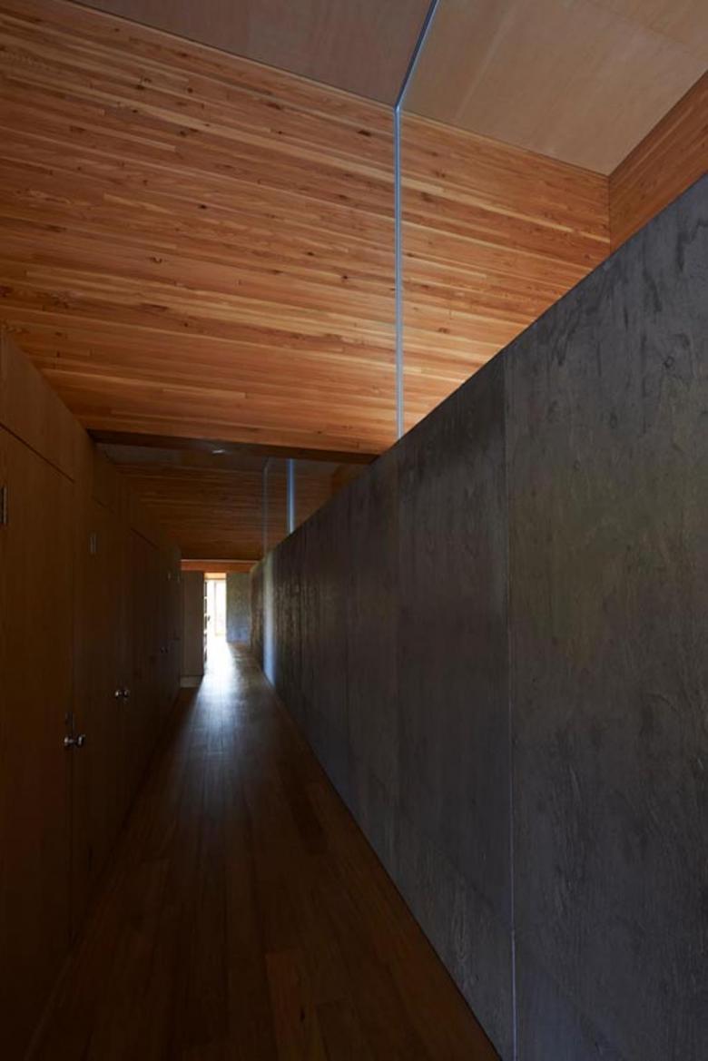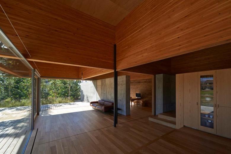 それは豊かな周辺へと伸び行くよう離散的に配されたRC壁造による解放的な空間の上層に、これとは無関係に木壁造による内向的で程よいスケールの空間をストンとのせることで現実化されたが、これは一枚の平面に2種類の異なる"通り芯"の体系が重ねられたことを意味している。"通り芯"が"通っていない"という、これまでの建築ではありえなかつたことが起こるわけだが、これによって、質の異なる上下の空間は跨ぎあい始め、複数の結びつきや光の干捗が生じ,単調ではない豊かな現象が発生することになった。