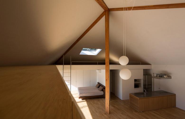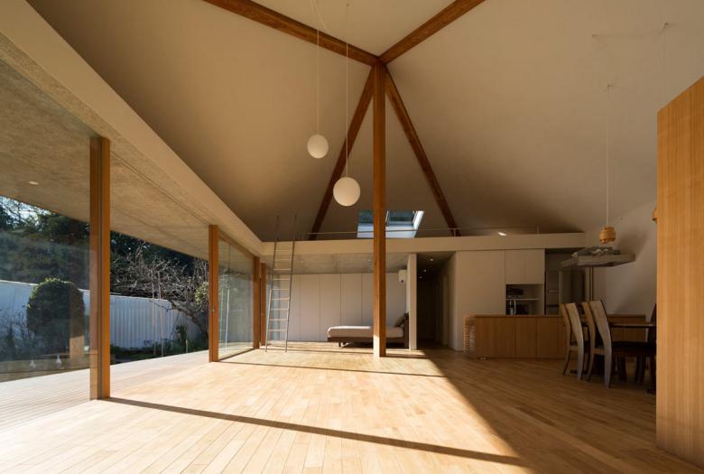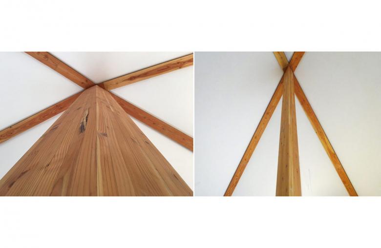 一本のセンターコラムが錘状の屋根を持ち上げる“吊り屋根”の形式であるため、外周壁は通常のように圧縮力を負担する必要がなく、基本的に構造としてフリーになる(倒れ止め程度にほんの少しの引っ張りを受け持つだけでいい)。これは、周辺環境との多様な関係に応答する“境界”を形成するに都合が良い。中心が最も高くなる空間の形状や大黒柱の存在は、暮らしに程よいまとまりや温かみを与えることだろう。