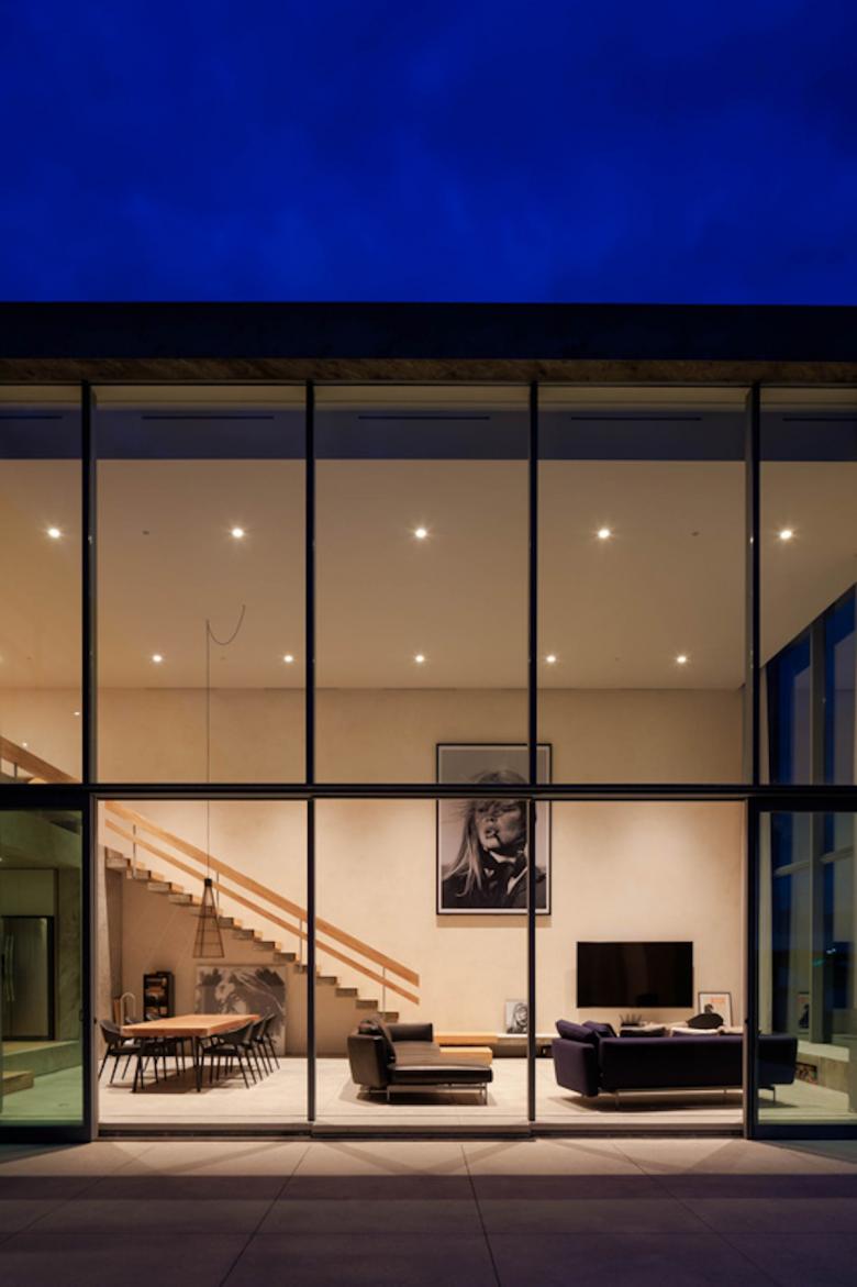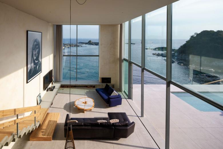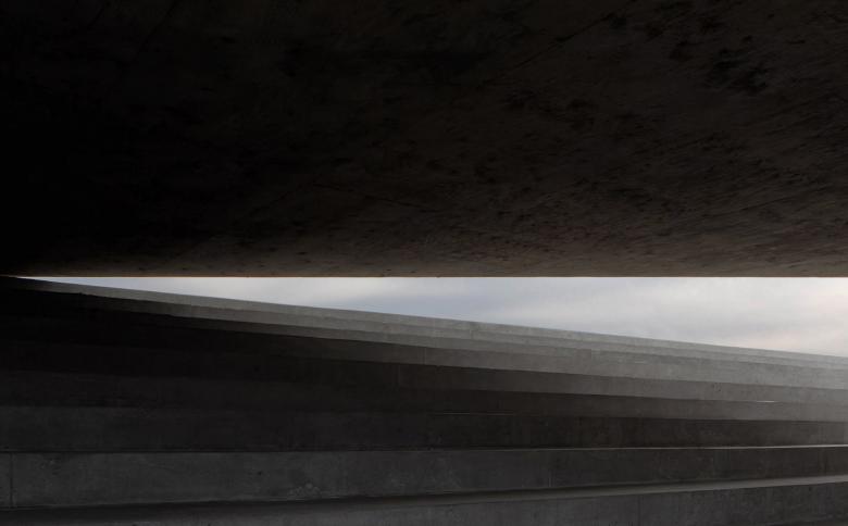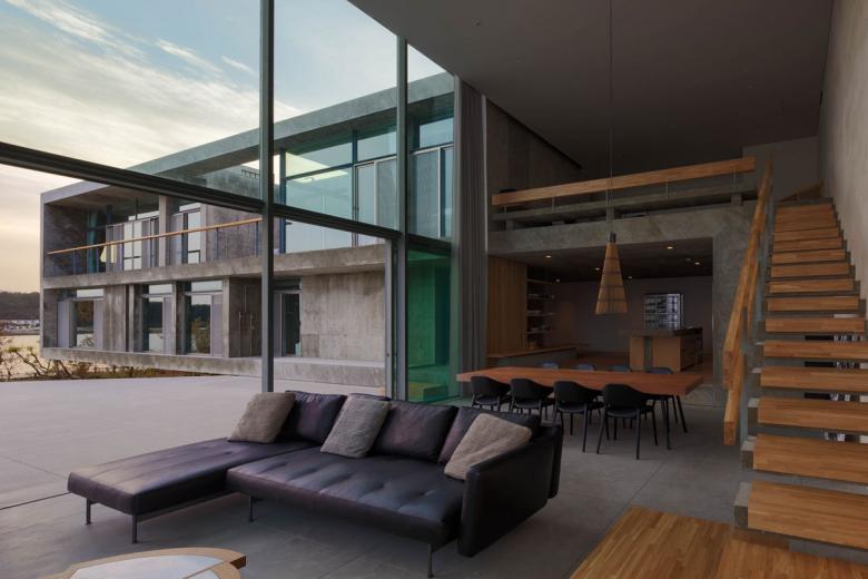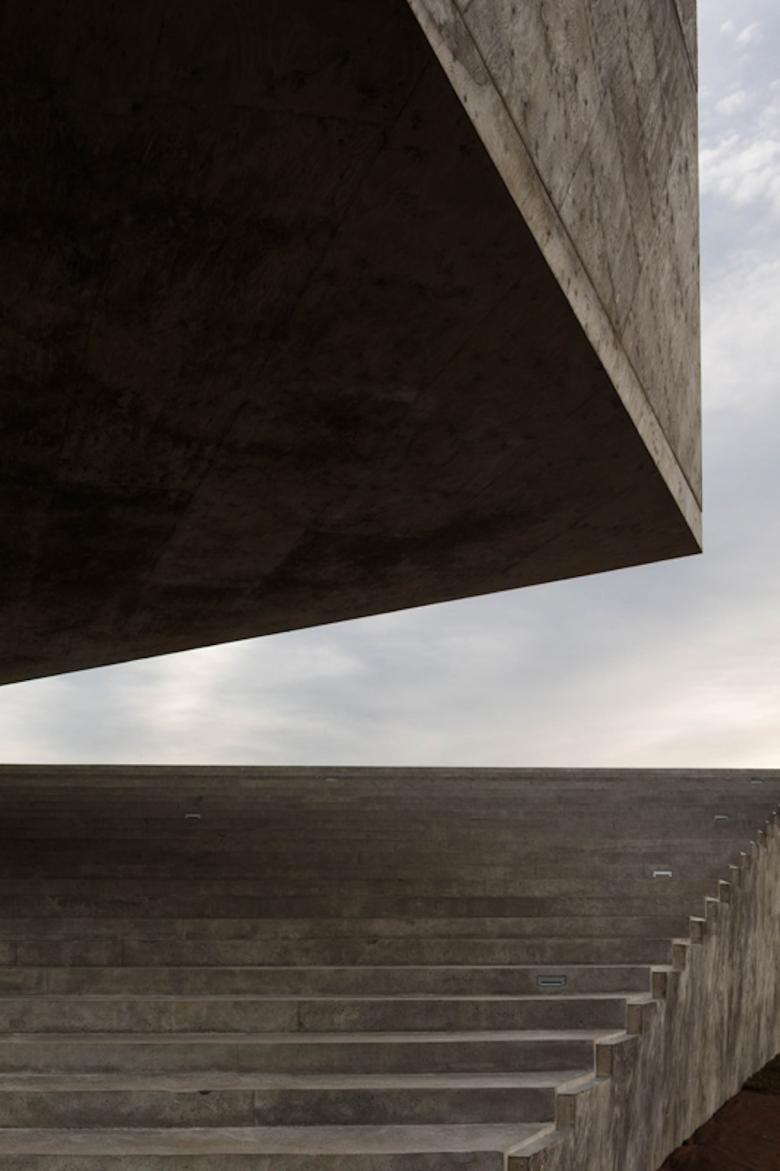 それはL字のボリュームをくぐり、空と海洋へと放たれ上昇するように人々を誘う大階段である。この特別な角度を持った最初の動線の投げ出しが、空間の外・内を滑らかに移動し、最後の建築的半島である富士を眺めるルーフテラスに終わるシークエンスを生み出した。地形的操作によって得られた全ての風景や環境の特徴要素、さらには周囲との関係性は、導入された一本の斜めの線に始まるシークエンスによって、境界なく調和した全体へと統合されるだろう。 建築的に“土地”を作り出し、これに一本の特別な線をひくことで、“永続的な人間の居場所”を生み出したのだと、考えている。