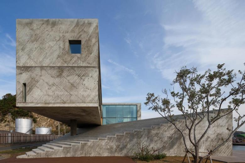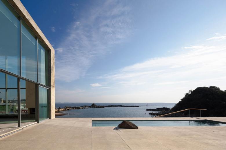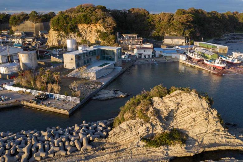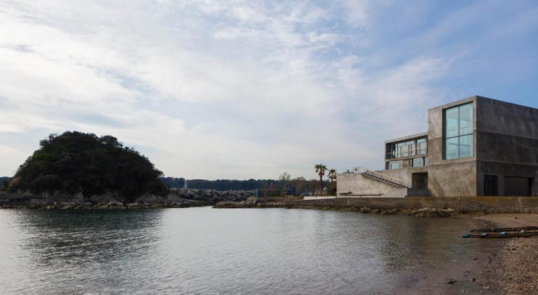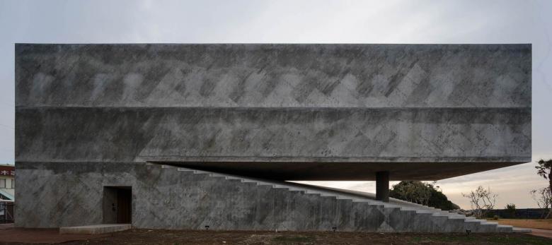 半島の先端、東に大洋に面するこの敷地で私たちが考えたことは、純粋に“土地”として建築を捉えきることである。季節や時間毎に階調豊かに、時には劇的に変化する海や半島の岩山からなる“無垢の自然”には強い魅力があるが、しかしその反面、半島先端であるがゆえに周囲を遮るものもなく、しばしば強風や大波に曝される荒々しい土地柄は脅威でもあり、ここでは"フレーム"は心もとない。求めるべきは、この土地の魅力は拡張し、その脅威は低減する建築的“地形”の創出であると考えた。しかし同時に、味わいかつ畏怖すべき“無垢なる自然”に対して導入する人為的操作は、最小限に留めるべきでもある。