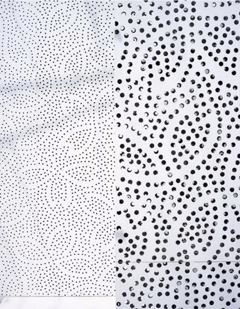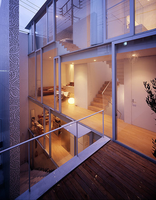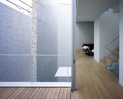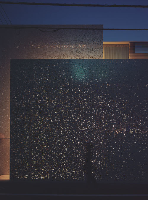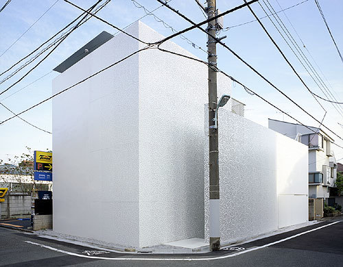 東京の住宅地に計画された夫婦二人のための住居兼オフィス。 都内でも有数の地価の高いエリアに敷地はあるが、他の都心部の住宅地の例に漏れず住宅が雑然と密集した状況から、その価格ほどに住環境として良質であるとは言い切れない。 ここに更にもう一つ住宅を押し込むことより、良好な住環境を生み出すことの方が、まず先決であるように感じられた。 思い出したのは、ミースとフィリップ・ジョンソンによる二つの著名な「ガラスの家」である。室内を裸で歩きたくもなるような、その自由さと開放感は、ガラスそのものの透明性にもよるが、なにより建築を取り巻く気持ちのよい周辺環境=「森」によるところが大きい。 「森」がすでに気持ちのよい住環境を形成しているのである。だから、建築はごく薄く透明な皮膜で内外の空気を切り分けるだけでいい。 居住に適した環境さえあれば、「住宅」そのものさえ必要がなくなっていくことを明快に示している。 求めたのは、この「森」の代わりとなる存在である。 具体的には、居住に適した環境を生み出すため「の」の字型にくるりと巻かれた2枚の大きな帯状の面を敷地内に設置することで、良質な住環境を発生させる事を試みたのである。 それぞれ高さ7.5mと5mの木漏れ日のように光を透過する、厚さ3mmのステンレス製のレース状の、自立する壁面である。 伊勢型紙の伝統文様である桜のパターンに沿ってパンチングされている。 このように抽象化された桜の森を分け入ると、「気持ち良く住まえる「予感」のする環境」が現れる。 ここには「住宅」という「構え」は、もはや見当たらない。ここは純粋な「住環境」であって、記号化されたいわゆる「住宅」ではないし、ましてや「住宅地」でもない。 都市の届かない 明るい深部 が、東京に生みだされたのである。