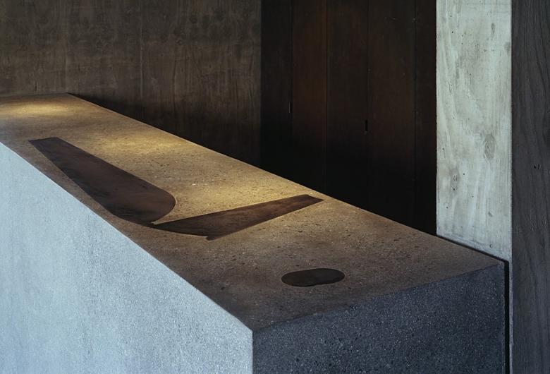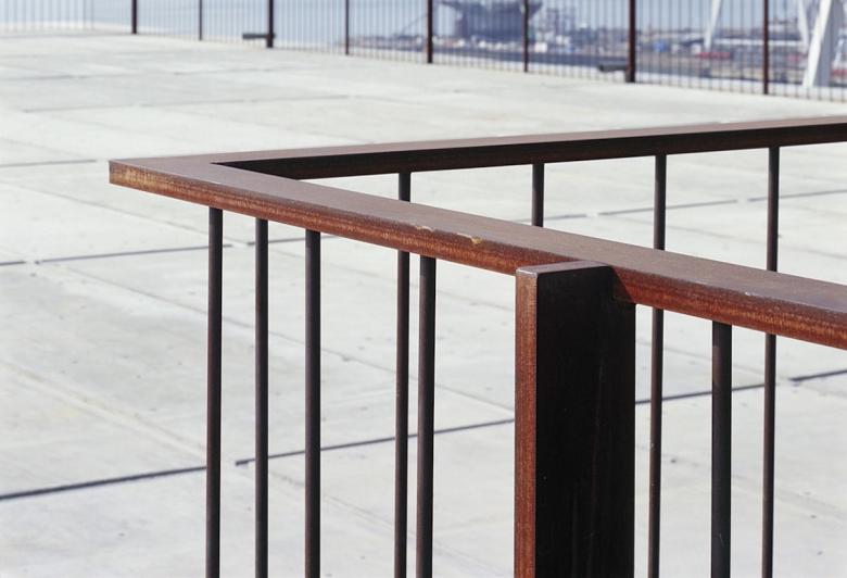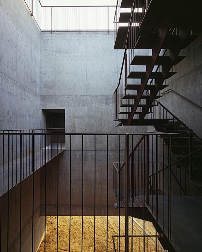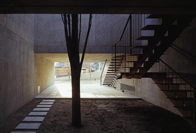 大階段、スロープ、ふたつのライトコート内のコールテン鋼製の階段(塩害に備えて金物は全てニッケル含有のコールテン鋼露しとしている)、それらが面する中廊下というように、導線はコンクリートの塊のような建築をさまざまに取り巻きながらシークエンシャルに展開し、それはそのまま地域の導線に接続されることで、社宅内の住戸群は街から乖離せず、むしろ街の一部として地域に連続することも成功している。