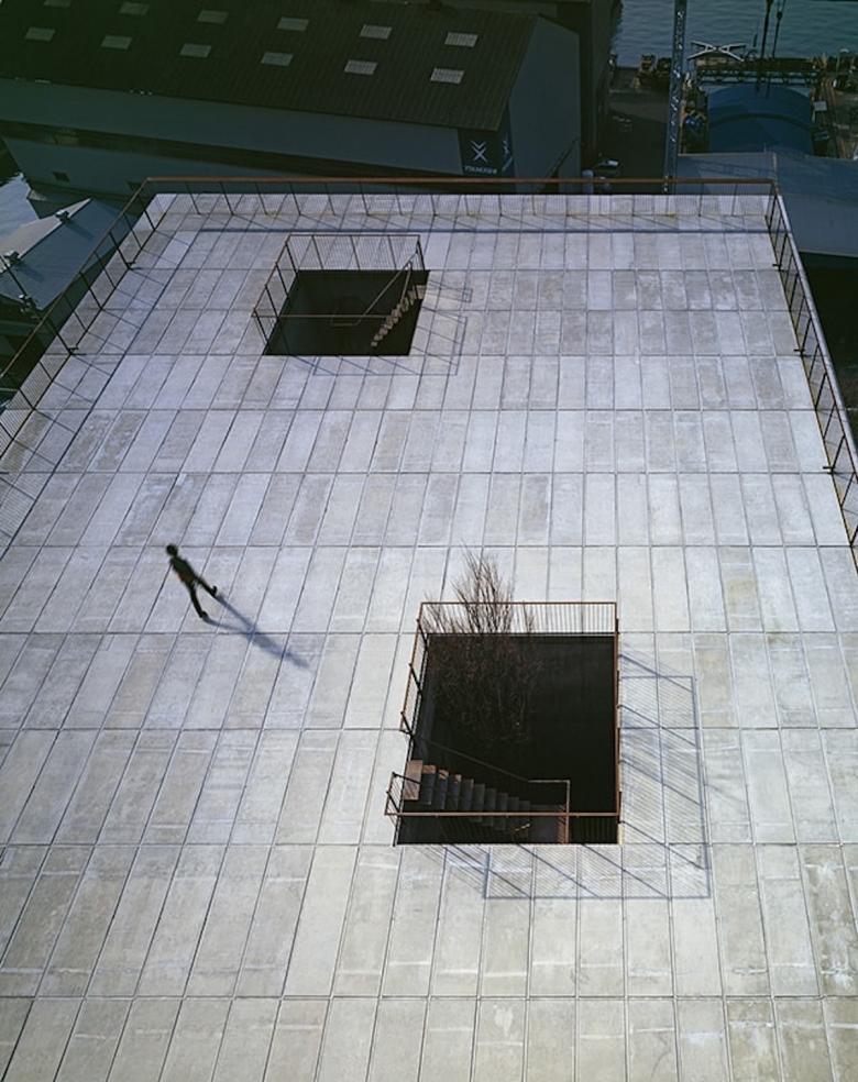 広場に穿たれたふたつのライトコートは、そこを降りる事で各住戸へと向かっていく移動空間でもある。面積的に高効率な形式とはいえ、陰湿になりがちな中廊下にはこのふたつのライトコートが光と風を届け、同時に各住戸の光・通風環境を大幅に改善してもいる。