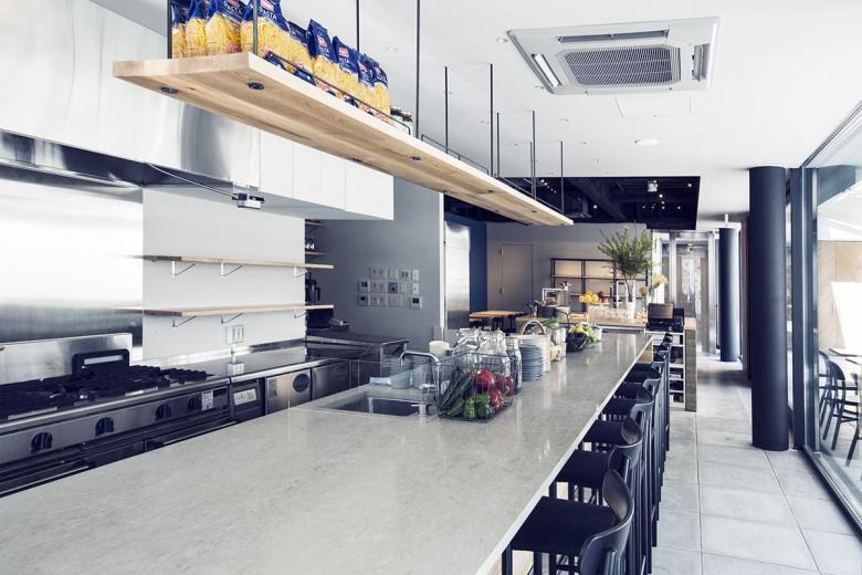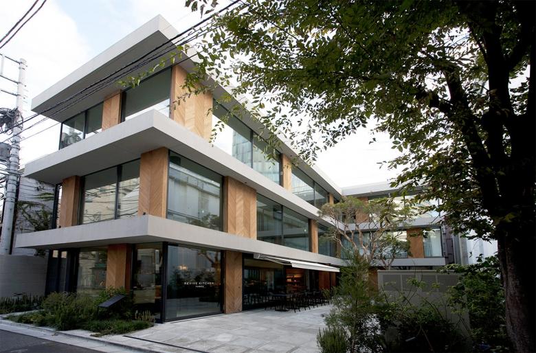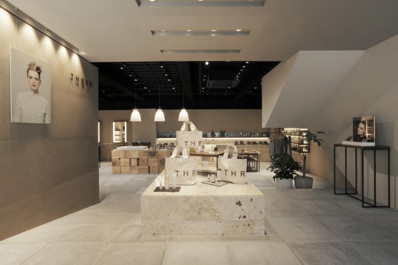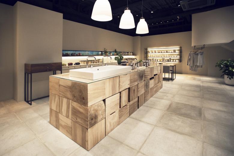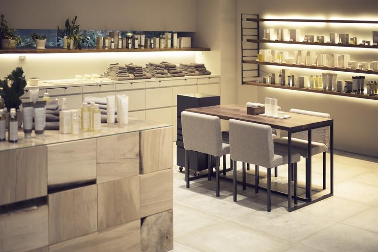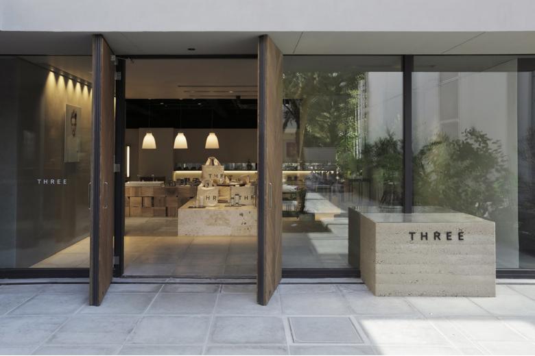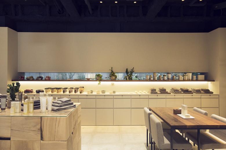 建築に加えて、3店舗の内装を設計したが、それぞれのデザイン意図は共通している。それは建築と同じく表層的な大声のデザインの対極として、表層・下地の区分のない「ムクなる素材」で全体を構成するというものだ。具体的には、化粧品の原料でもある「化石珊瑚石」、生命を育む土壌としての「版築」、瑞々しい森を現す「ブナブロック」、これら3種のムク材を単なる仕上げ材としてではなく、大きなマスとして配することで、表層的な記号ではない、自然の世界そのものがもつ奥深く解像度の高い世界を立ち現すことを試みたのである。