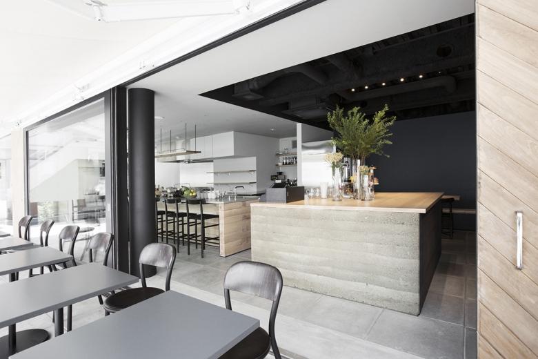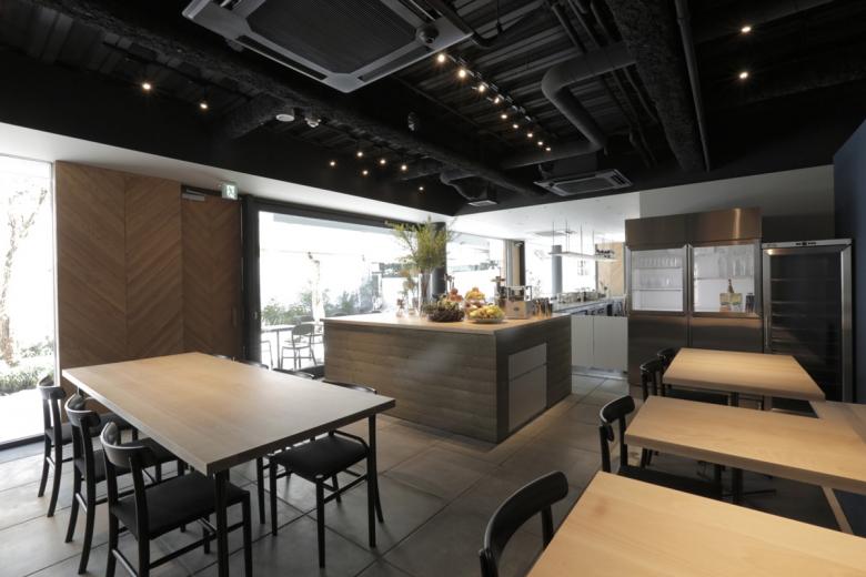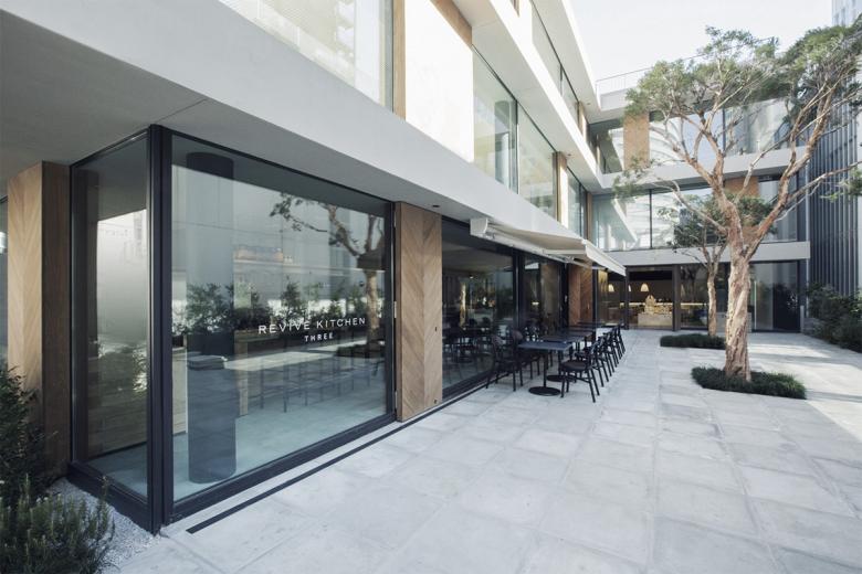 先ず、都市の「圧力」をキャンセルする仕掛けとして、敷地角の3割近い面積をポケットパークという「建てない領域」として確保してしまった。そしてその「都市の空隙」に面するように各店舗を配置することで、都市の圧力から一歩引いた環境を獲得しようと試みたのである。建築的にもL字型のセメント質のスラブが三枚空中に浮かべられただけの極めて単純な形式をとり、余計なデザインの「声」が発生しないように配慮している。