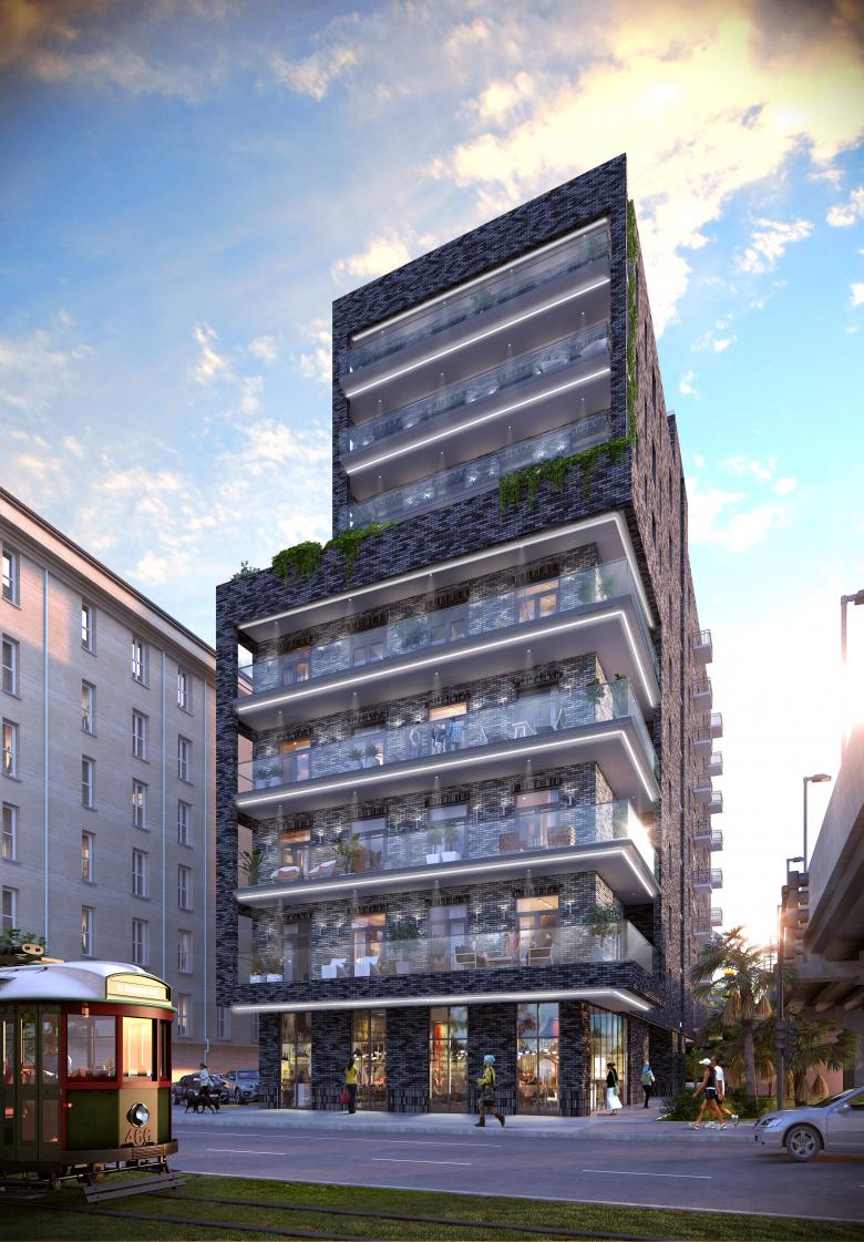NANO was engaged to provide schematic design and renderings for this 10-story mixed-use building.It will include retail on the first floor and either condos or hotel rooms in the floors above. Sited on historic St. Charles Avenue, it offers quick easy access to the CBD, Uptown, I-10 and streetcar. Located one block from Lee Circle, the Mardi Gras parades will go right by the front of the building.