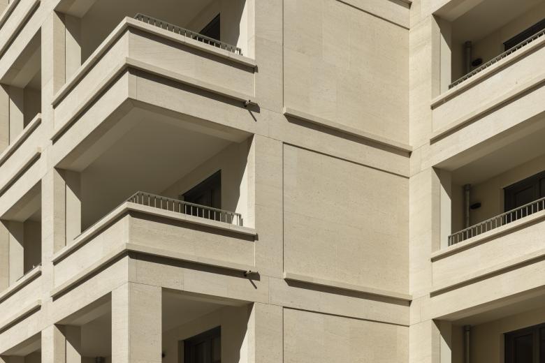 The main façade is plastered in a subtle grey tone. Grey has been used as an elegant colour, as an expression of simple refinement and as an invitation to the neighbours to cultivate togetherness. For the grey of the four buildings, O&O Baukunst has proposed the tones Jade 35, Moos...
