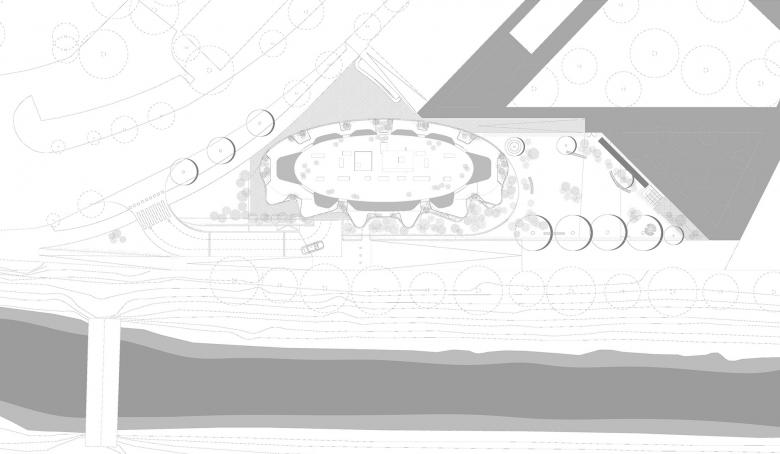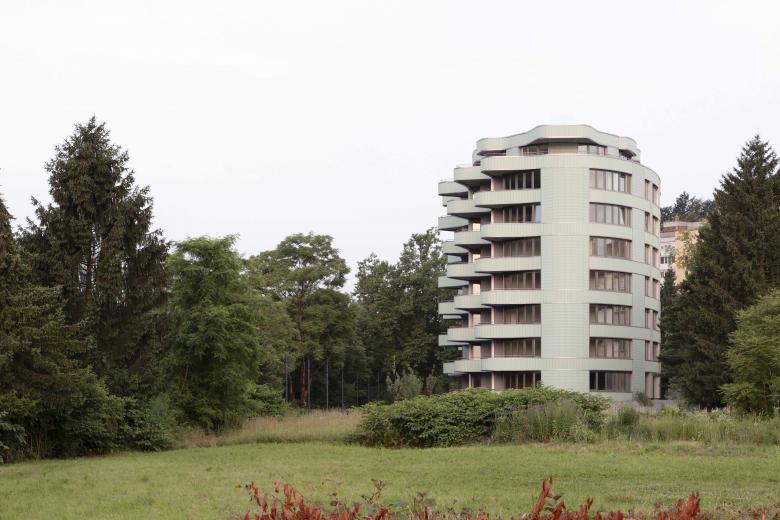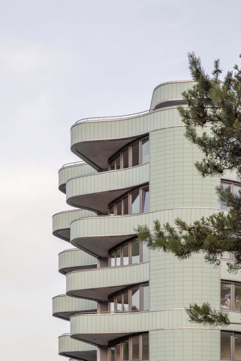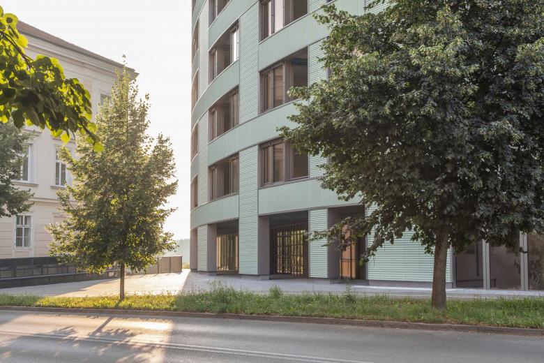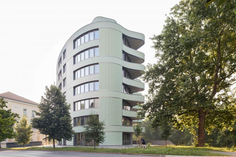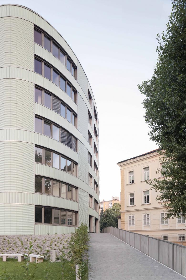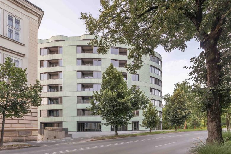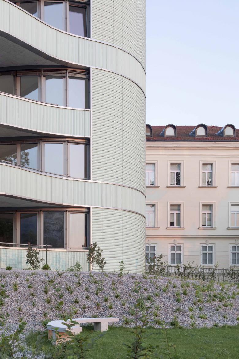 Despite being a primarly profit-oriented residential development, the elliptical building, situated at the edge of a triangularly shaped site, is surrounded by a variety of non-fenced, open and inclusive public spaces. An entry plaza is created between the inner city ring, a historical school, and the new building, continuing to the covered arcades with entrances to the building. On the eastern side, a garden with a children's playground forms a vital part of the residents' outdoor living space. A promenade along the river canal links the building to a nearby neighborhood. Here, garage and service entrances are located.