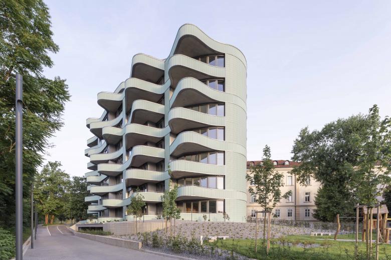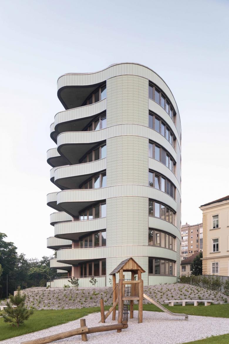 The building's façade cladding is composed of interlaced horizontal and vertical strips of mint green undulated ceramic tiles. The weaving of the strips evokes a textile pattern, highlighted by vertical and horizontal lines in mint green tone. The balconies act as horizontal strips that extend from the level of the façade surface towards the Golovec greenery.