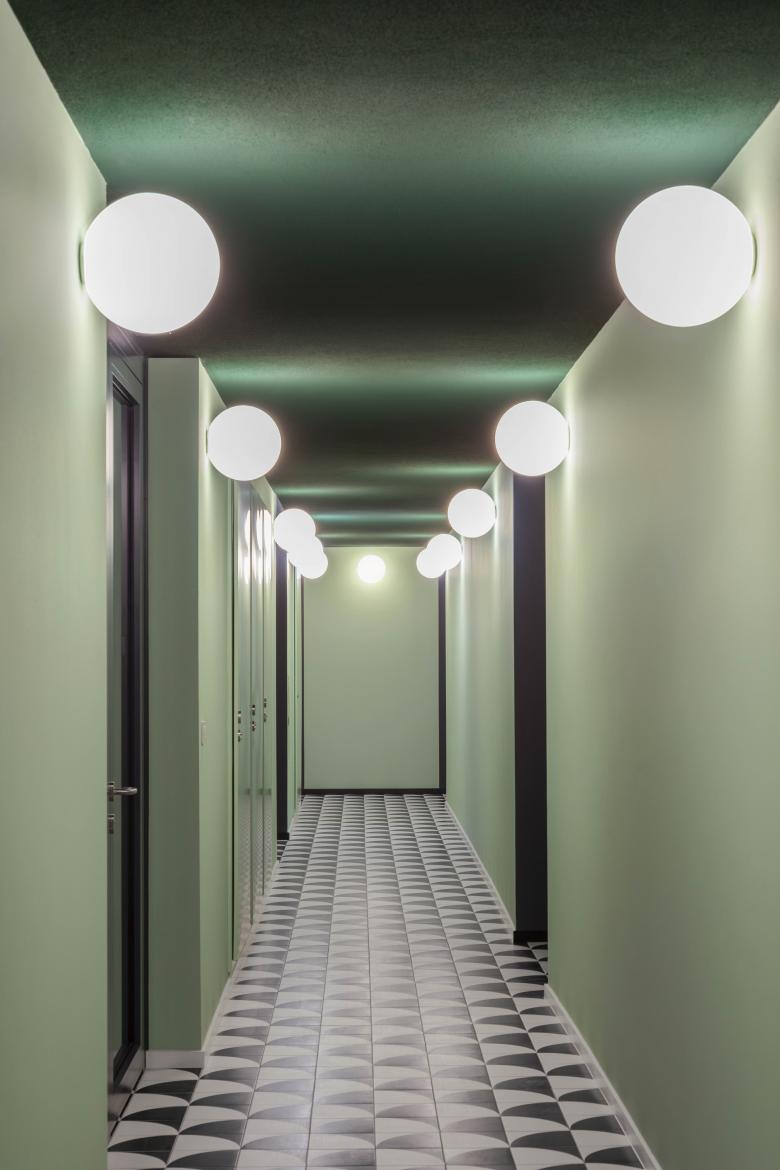 The mint green color of the exterior extends to the entrance lobby and the inner corridors. Large wall lamps and ornamented ceramic tile floors enhance the distinct character of the Elipse's interior common spaces.