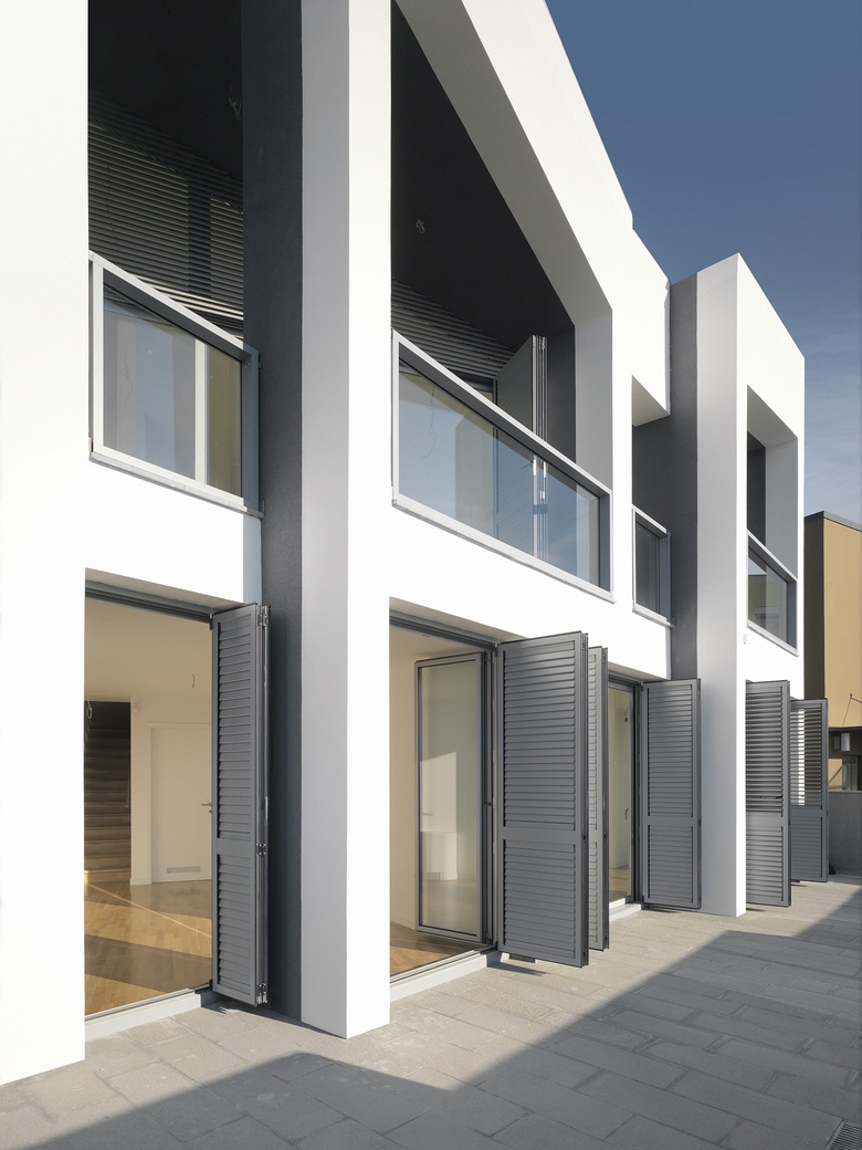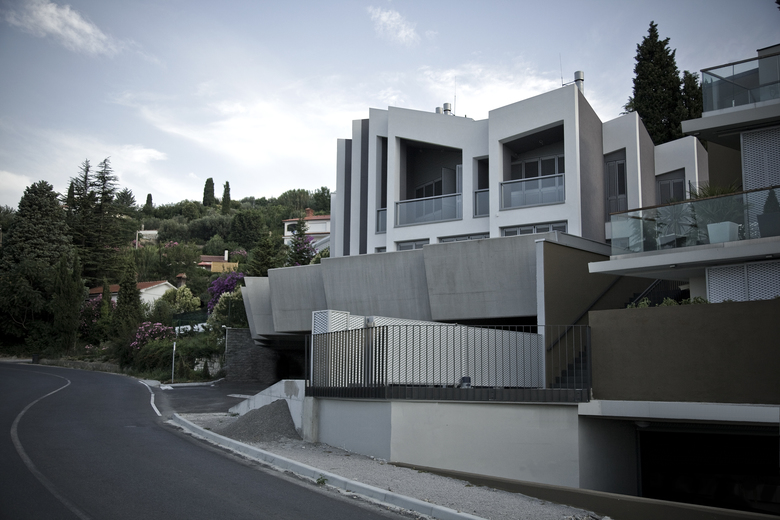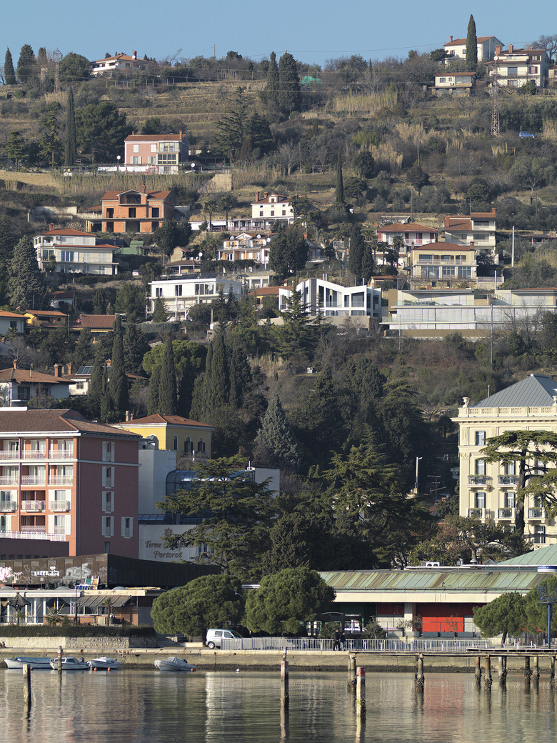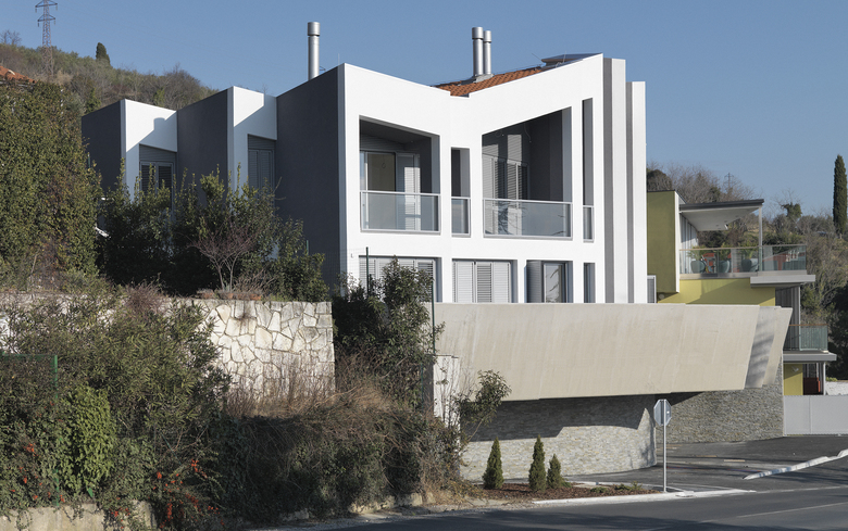 Villa Beli križ stands on the incline of the hill slope above Portorož. The matrix volume of the villa consists of four two-storey apartments of equal size with an associated outer garden space, terrace on the shadow side and terrace with a pool on the sunny side. Within the villa, apartments are arranged in such a fashion that the large glazed surfaces opening the apartments to the outside offer a colourful variety of views of the sea and of the horizon.
