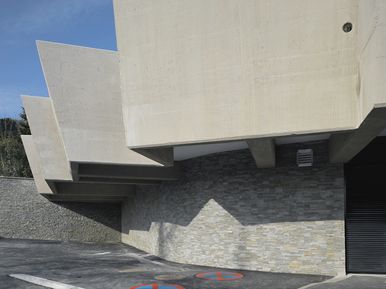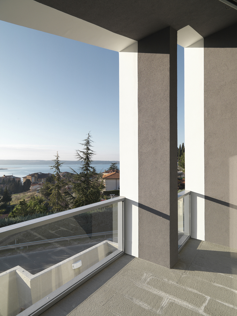 In conjunction with the villa's setting on the garden-covered podium of the garage, this serves to emphasise the presence of the villa in the context. Alternating perceptual cinematic opening and closing of the villa's volume at our passing-by makes advantageous use of the positioning of the villa on the street bend. The white grid of the structure cladding creates a distinguishable element in the near surroundings, as well as a dialogue with the white grid balconies of the Porotorož hotels downhill by the sea..