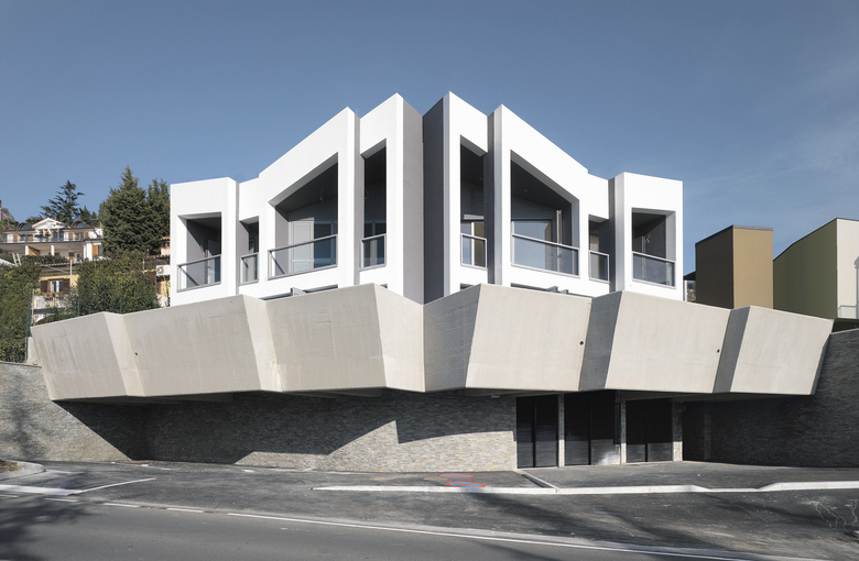 At the same time, this arrangement provides for the desired privacy and intimacy between the villa's residents. In this way, from his apartment on the upper floor, a resident will always have a view of and access to his part of the garden on the lower floor. Consequentially, this exhibits in the ambient diversity of the apartments' interiors. Opening of each internal space towards the sea and alternating twin hooded roofs lead towards the "winged" form of the building's sides. Pairs of apartments are mirrored across the central axis.