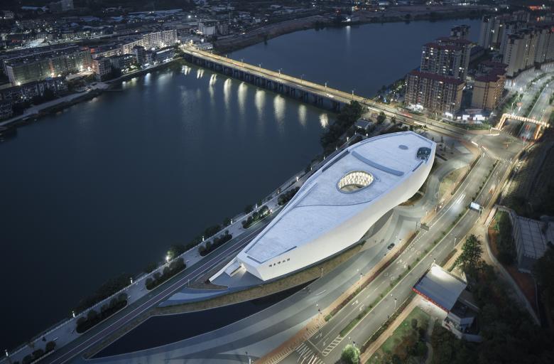 The connecting space between the museum and the urban planning exhibition center is a cultural & book bar that incorporates display functions. The ramp spirals upwards and extends to the rooftop terrace, which connects with the riverside walking trail and helps integrate the building’s interior circulation route into the city. This is a key feature of architectural space organization, which enables people to identify intangible spaces through the tangible internal and external architectural surfaces.