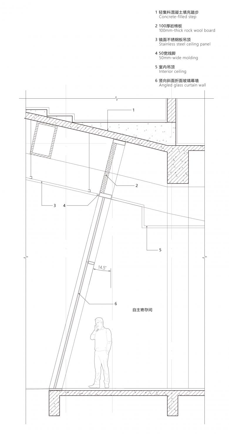 In order to form a simplistic, massive yet modern architectural image, the project mainly employs stones, glass and specular stainless steel panels. Triangular specular stainless steel panels with a side length of 1,200mm are applied to the suspended ceiling of the atrium. Under daylight, the reflective suspended ceiling produces a mottled light and shadow effect, while also generating a distinct contrast with external walls which feature rough natural textures. In addition to recording the daily activities in the “urban living room”, the mirror-like ceiling also echoes the mountains and water in the surroundings, making people feel like walking into a painting reflected by mirrors.
