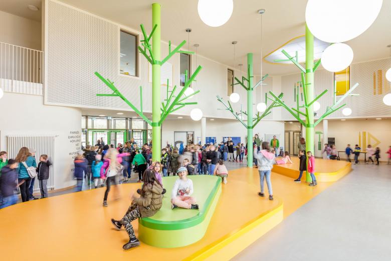 Innen zeigt sich die Schule als farbenfroher Erlebniswald. Grün, Gelb und Orange weisen den Weg durch die Lernlandschaften, große Piktogramme und Symbole helfen bei der Orientierung. Das lichtdurchflutete Foyer ist als Aula und Veranstaltungsraum multifunktional nutzbar. Lichtkuppeln und Leuchten fördern eine angenehme Aufenthalts- und Lernatmosphäre.
