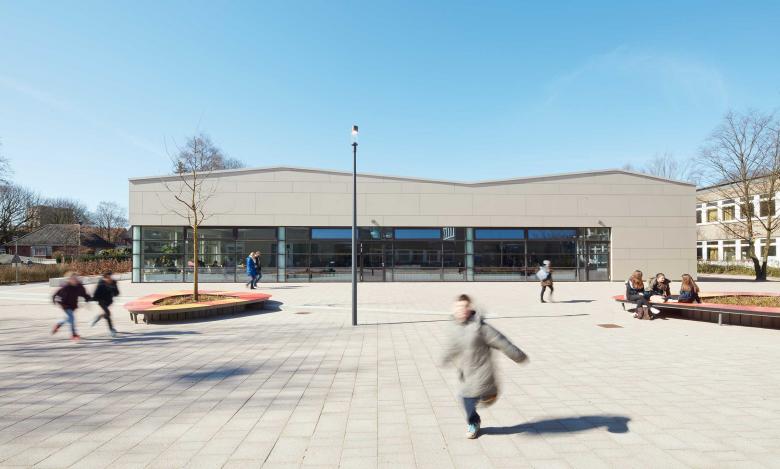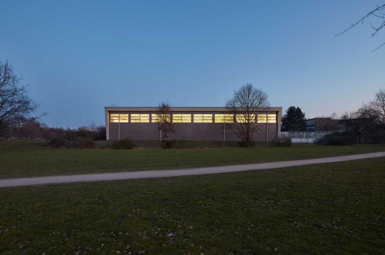Der Neubau der Zweifeldsporthalle erweitert das bestehende sportliche Angebot der Schule, das zuvor durch eine Dreifeldsporthalle abgedeckt wurde. Die Sporthalle ist autark nutzbar und öffnet sich durch großflächige Fensterelemente, die blendfreies Tageslicht in den Raum bringen und so eine angenehme Atmosphäre für Sport und Bewegung schaffen.