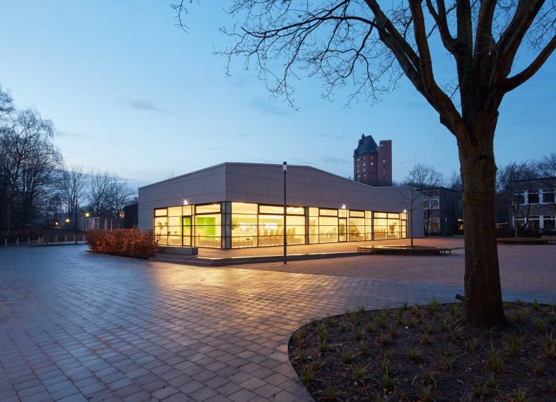 Die Mensa, die das Gelände zur westlichen Seite hin abschließt, bildet den neuen Mittelpunkt des Schulalltags. Sie verbindet Funktionalität mit architektonischer Eleganz und ist multifunktional nutzbar: Der großzügige Essbereich kann durch mobile Trennwände in verschiedene Bereiche unterteilt und für Schulveranstaltungen oder außerschulische Events genutzt werden.