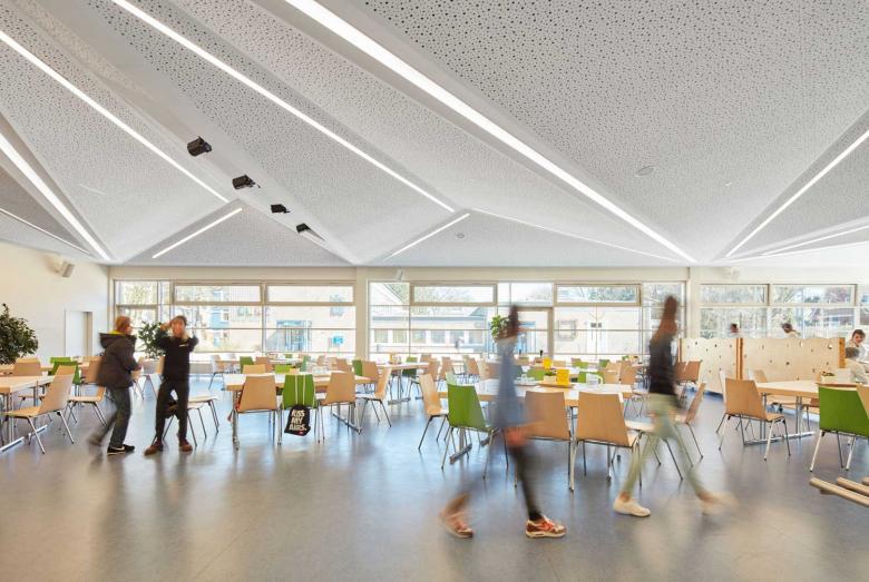 Die Mensa ist vollständig barrierefrei gestaltet, um allen Nutzer:innen, insbesondere Menschen mit körperlichen Beeinträchtigungen, einen uneingeschränkten Zugang zu ermöglichen. Ein besonderes Augenmerk lag auf der Gestaltung der Akustikdecke, die speziell auf die Bedürfnisse hörgeschädigter Kinder abgestimmt wurde. Durchzogen von Lichtbändern mit energiesparenden Leuchtmitteln trägt sie zu einer angenehmen Atmosphäre bei und erhöht die Aufenthaltsqualität erheblich.