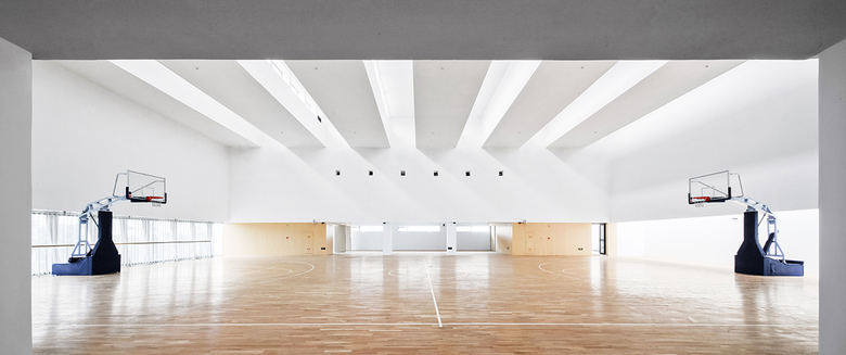 Each courtyard organizes classes from the same grade. Different functional and spatial layers overlap,with specialized classrooms on the ground level and ordinary ones on the first floor. Above the platform are the quiet classrooms for regular classes while underneath, the classrooms where education is engaged through entertainment and the diversity of pedagogical activities is demonstrated.