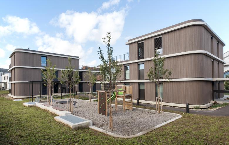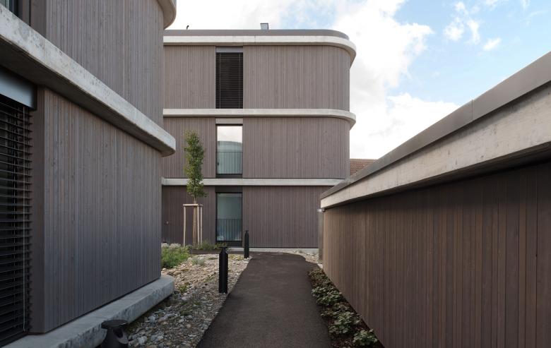 Ausgerichtet sind die Häuser nach Westen, nordseitig grenzt das Areal an ein Gewerbequartier. Dank einer geschickten Anordnung der drei formal ähnlichen Häuser konnte auf der Südseite eine geschützte Innenhofsituation geschaffen werden.