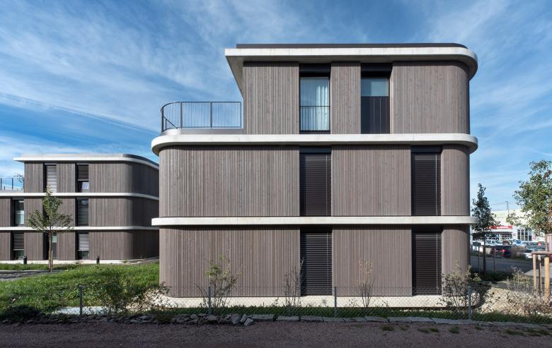 Das Fassadenbild der Häuser wird von vier mächtigen, abgerundeten Betonscheiben geprägt. Diese ragen teils weit heraus und umfassen als „optische Bänder“ eine vertikale, dunkelgraue Holzschalung. Charakteristisch sind auch die raumhohen Fenster und die abgerundeten Metallgeländer, alle in Bronze-Farbe gehalten. Die zurückgesetzten Attikawohnungen verleihen den Bauten Leichtigkeit und Eleganz.