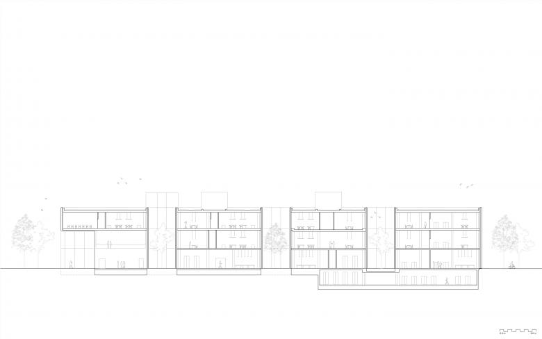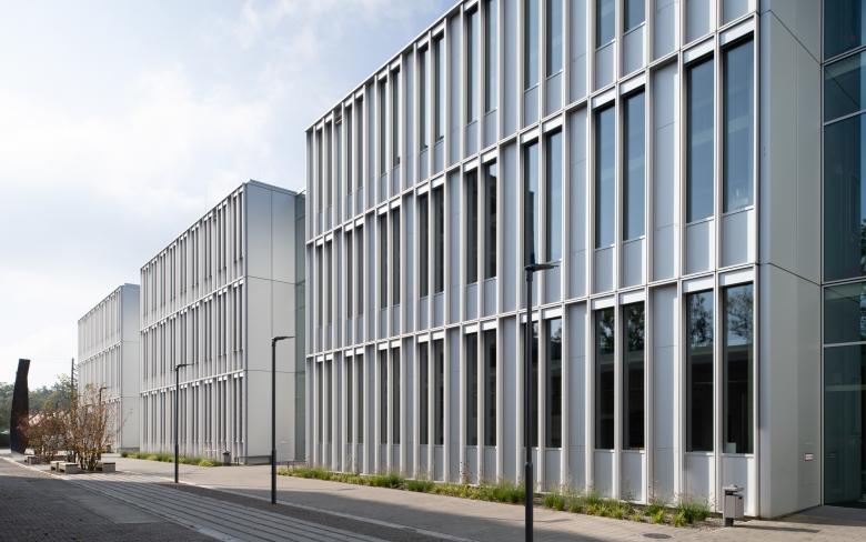 Als Gebäudehülle wurde eine Elementfassade aus Aluminium und Glas entwickelt, die der geometrischen Ordnung des Stahlbetonskelettbaus folgt. Nord- und Südfassade bestehen aus Kastenelementen mit einem auf das Gebäuderaster abgestimmten Achsmaß von 2,34 m. Dieses gliedert sich in einen horizontalen, opaken Brüstungsbereich und einen vertikalen Teil mit schmalem opakem Lüftungsflügel und breiterer Festverglasung im Verhältnis 1/3 zu 2/3. Auf der Ostfassade wird dieses System aus Kastenelementen mit einem engeren Raster (je 1/3), variiert. Grundsätzlich folgt die Planung und die Ausführung den Prinzipien des nachhaltigen Bauens (BNB silber) mit einer hochwärmegedämmten Hülle und robusten Baumaterialien. Durch die Energieversorgung aus nachwachsenden Rohstoffen folgt die Planung der Zielvorgabe EnEV minus 20%.