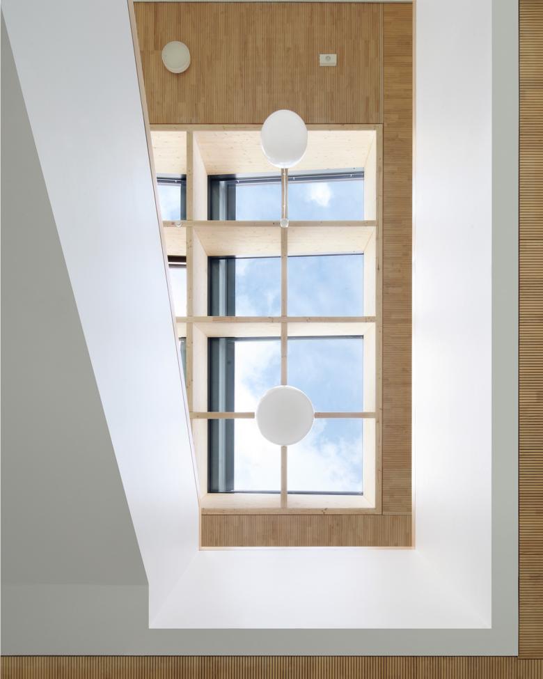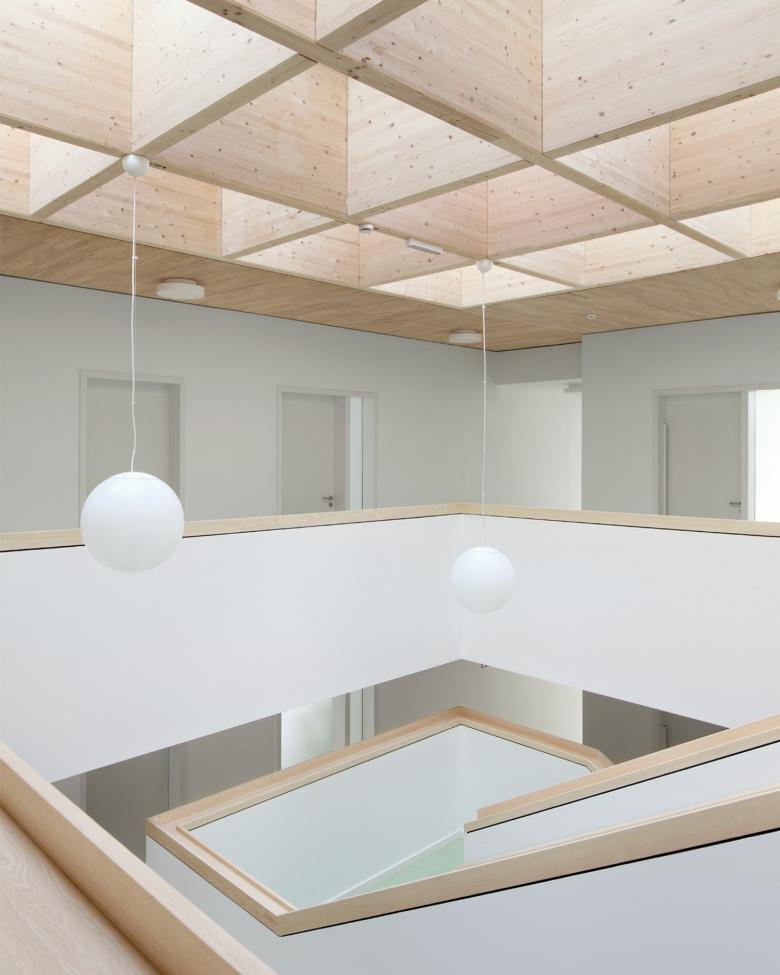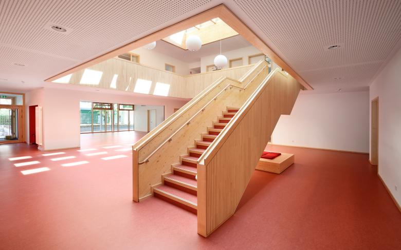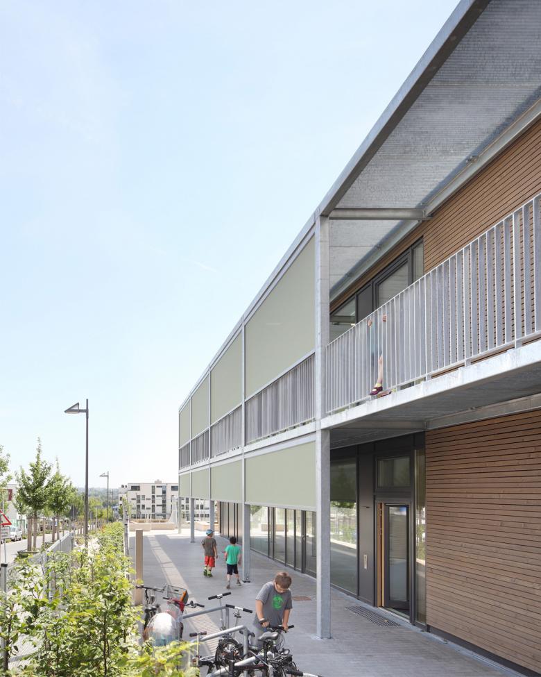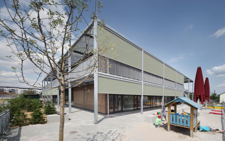 Die Einrichtungen bieten Platz zur Entfaltung für jeweils 100 bis 120 Kinder im Alter von 0 bis 14 Jahren. Der zentrale „Dorfplatz“ ist dabei Dreh- und Angelpunkt aller Aktivitäten im Haus. Seine hohe Aufenthaltsqualität als Außen- im Innenraum erhält der Dorfplatz dabei durch sein ausgewogenes Raumvolumen sowie die schwebende Dachverglasung. Der Wechsel von Tages- und Jahreszeiten ist spürbar, der Trägerrost aus Brettschichtholz filtert das einfallende Licht und bestimmt die Atmosphäre in angenehmer Weise. Um den Dorfplatz gruppieren sich über zwei Geschosse windmühlenartig acht „Bausteine“, in denen die Gruppenräume wie auch die weiteren Nutzflächen untergebracht sind. Die vorgesetzte Stahlloggia dient als Übergangsraum zwischen innen und außen, in der Stützenebene ist der weitgespannte, textile Sonnenschutz angeordnet. Ganz nebenbei lassen sich mit der umlaufenden Loggia alle erhöhten Anforderungen an die Rettungswege erfüllen.
