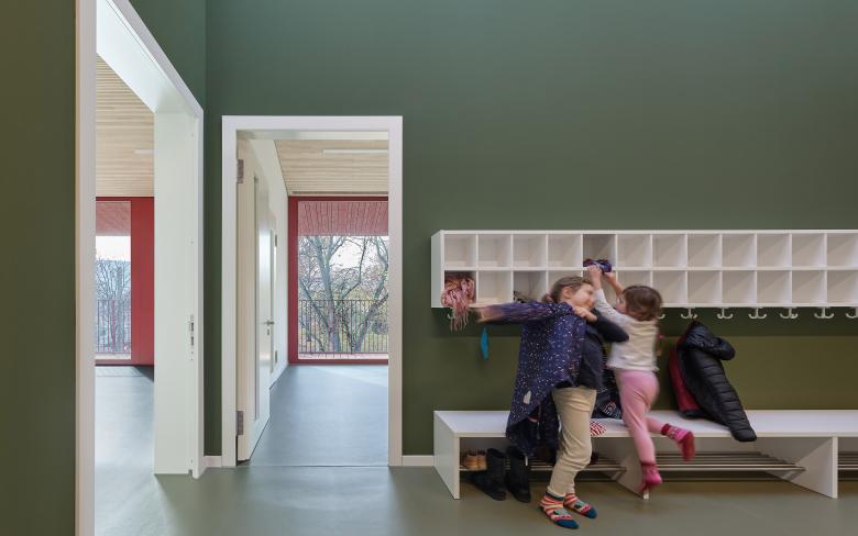 Der Haupteingang befindet sich auf der Nordseite und ist in der Fassade gut ablesbar. Das Foyer, das auch als Elterntreff dient, ist von Norden nach Süden durchgesteckt und öffnet sich zur Gartenseite. Von hier aus wird der Mehrzweckraum erschlossen sowie über einen Flur die Gruppenbereiche im Süden und die Nebenräume im Norden. Allen Aufenthaltsräumen im Obergeschoss ist eine Loggia vorgelagert. Zwei Außentreppen, die sich plastisch vom Baukörper abheben, führen auf direktem Weg vom OG in den Garten mit Freispielflächen.