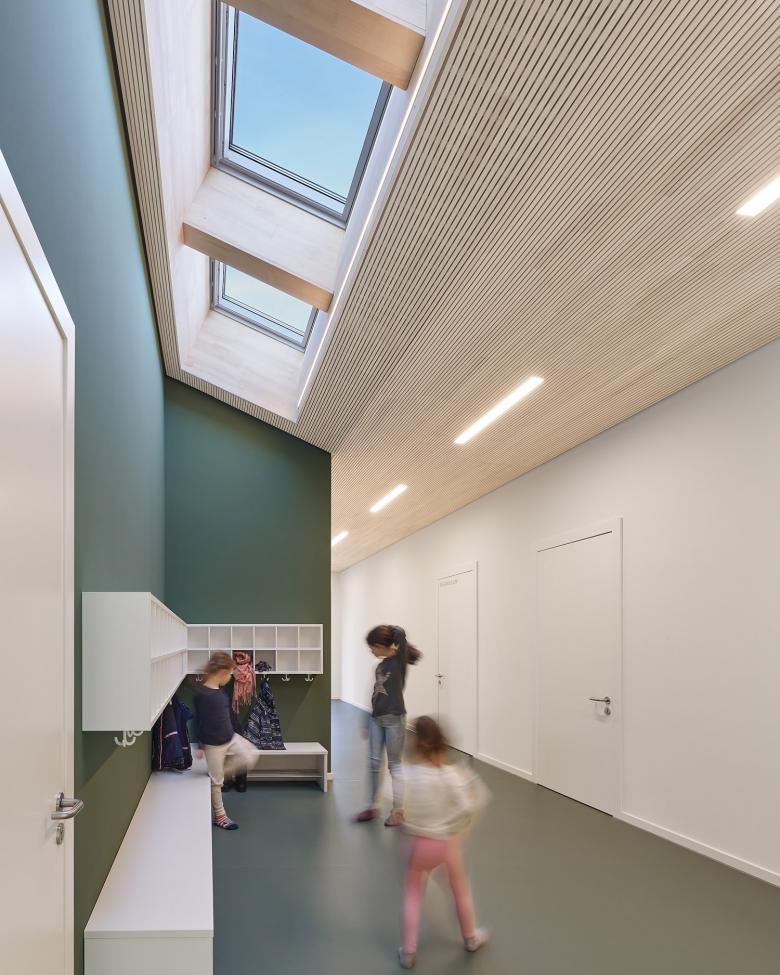 Die klare Gliederung des Baukörpers in eine Gruppen- und eine Nebenraumzone ist in der Ausbildung der Fassaden sowie der Dachform ablesbar. Oberlichter im Dach entlang des Flurs unterstützen den Eindruck und ermöglichen eine gute Belichtung und Belüftung des Gebäudes. Durch die innere Gliederung des Gebäudes können Sanitär- und Lüftungsinstallation auf die Nebenraumspange beschränkt werden. Hierdurch lassen sich in den Aufenthaltsräumen größere Raumhöhen realisieren und Deckenabhängungen einsparen.