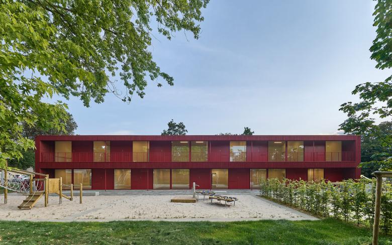 In Nachbarschaft zum Kulturpark Berg im Stuttgarter Osten liegt das Grundstück der KiTa Parkstraße. Der zweigeschossige Neubau der viergruppigen Kindertageseinrichtung fügt sich in den Grünzug mit historischen Baumbestand an der Stelle des Vorgängerbaus ein. Position, Gebäudeabmessung, Konstruktion und Materialität der KiTa leiten sich aus den besonderen Parametern des Grundstückes ab: Die Ortsbausatzung definiert die Gebäudetiefe von zwölf Metern. Position und Ausrichtung ergeben sich aus der Baulinie und dem von Westen nach Osten abfallenden Gelände. Die Gründung auf einer bestehenden Bunkeranlage im Untergrund macht einen Leichtbau aus Holz alternativlos.
