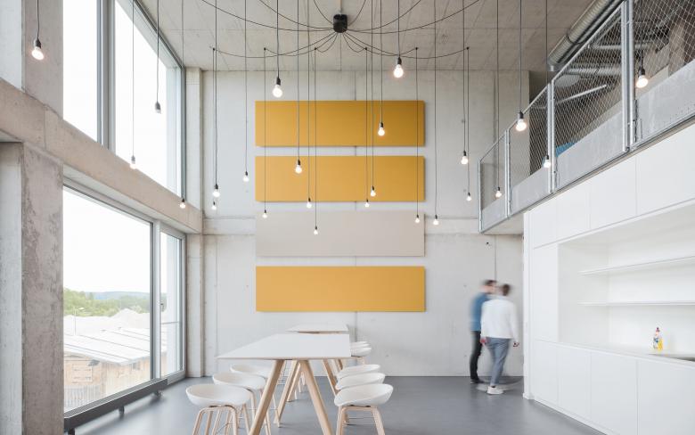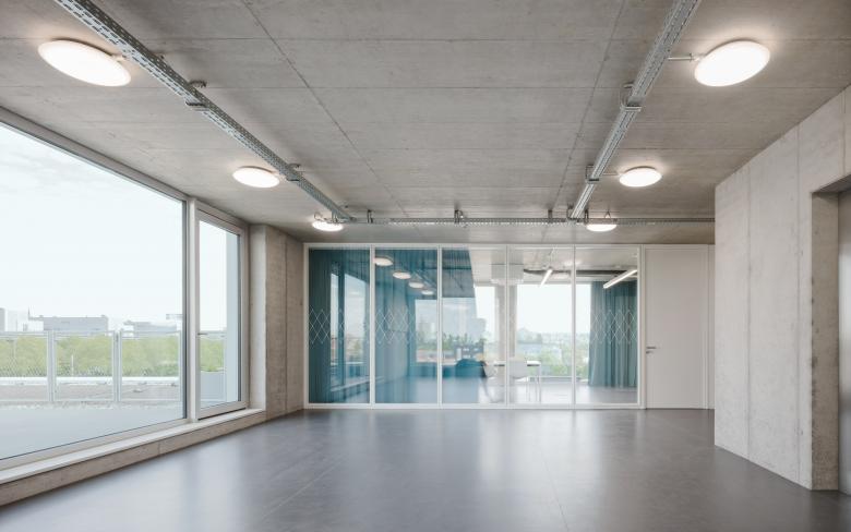 Die robuste bauliche Struktur und Organisation des Gebäudes erlauben eine vielfältige Nutzungsveränderung und Einteilung. Diese ermöglichen insbesondere eine prozesshafte Aneignung des Gebäudes durch die Mieter. Die Stahlbetonoberflächen im Innenraum wurden roh und materialfarben belassen. Für exponierte Betonflächen wird bewusst auf eine hohe Sichtbetonklasse verzichtet. Die Installationsführung erfolgt an den Decken sichtbar in verzinkten Stahlrohren und Kabelpritschen sowie in einem einfachen Hohlraumboden. Der industrielle Charakter wird durch die Verwendung von Halbzeugen betont und durch wenige gezielt gesetzte Akzente in der Möblierung kontrastiert. Aufgrund der Flächen- und Kubaturoptimierung, der Auswahl weniger industrieller Materialien sowie einem angemessenen Technikkonzept (so wenig wie möglich, soviel wie nötig), konnten die ehrgeizigen Vorgaben des Budgets eingehalten werden. Den Nutzern können nun kostengünstige Mietflächen in einem veredelten, unprätentiösen Rohbau mit Loftcharakter angeboten werden. Die exponierten Betondecken sind sehr gut für den Einsatz einer Bauteilaktivierung geeignet. Zur Beheizung und Kühlung wird daher geothermische Wärme und Kälte genutzt. Die Erschließung erfolgt über insgesamt 15 Erdwärmesonden mit Tiefen zwischen 90 und 130 Metern unterhalb des Gebäudes.