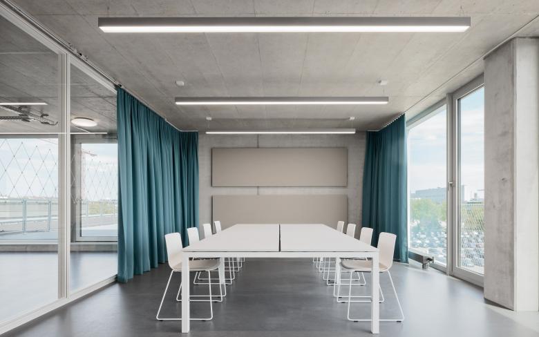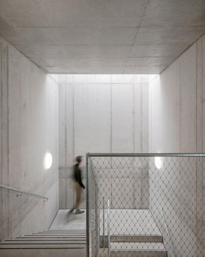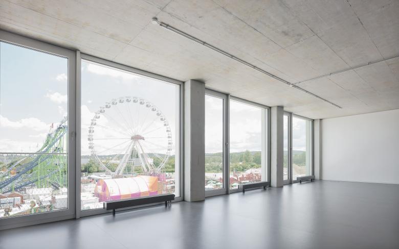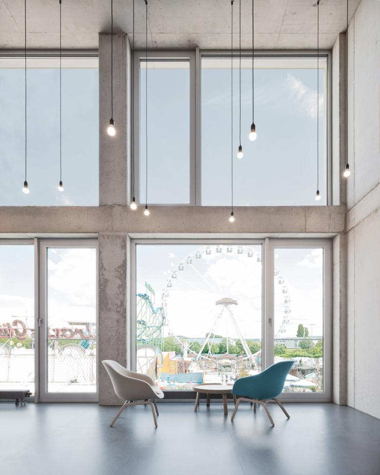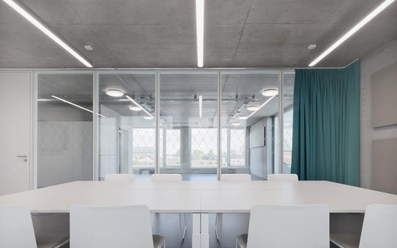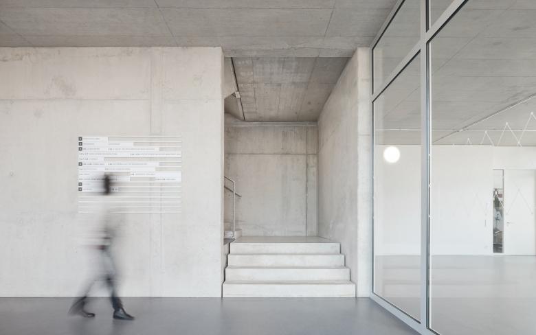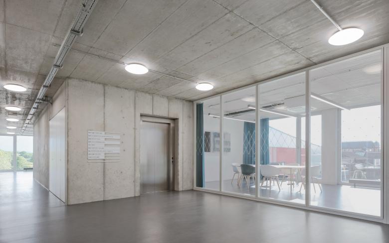 Der Eingang des FUX liegt auf der Westseite, am Ende der Verbindungsachse zwischen dem Kulturzentrum Tollhaus und dem Gründerzentrum Perfekt Futur. Über einen Windfang wird das zweigeschossige Foyer mit Cafeteria erschlossen. Dieser zentrale Anlaufpunkt im Gebäude bietet Raum für Pausen, Kommunikation und kleinere Veranstaltungen mit öffentlichem Charakter. Ebenfalls im Erdgeschoss angeordnet ist der Coworking Bereich, der als Aktivator eine dauerhafte Belebung der Erdgeschossebene ermöglicht, ganz im Sinne der Intention für das Areal des Alten Schlachthofes. Das FUX ist - gemäß der zu erwartenden dynamischen Nutzung des Hauses und in Anlehnung an die industrielle Geschichte des Areals - als zeitgenössisches Loftgebäude konzipiert. Aufbauend auf einem Raster von 1.25/ 3.75 Metern, in dem sich alle gewünschten Bürogrößen sinnvoll realisieren lassen, entfaltet das Gebäude seine rationale Struktur. Der Versatz der oberen Kubatur bleibt im Innenraum ablesbar. Die dadurch entstehende Gebäudeaufweitung bietet Raum für Erschließungskern und Kommunikationsbereiche in den Geschossen. Mittels Lufträumen sind die Kommunikationszonen untereinander über die Geschosse hinweg vernetzt. Die effiziente Organisation des Innenraums erlaubt punktuell räumliche Aufweitungen und Durchbrüche, die dem Bau trotz der engen Rahmenbedingungen Großzügigkeit verleiht.