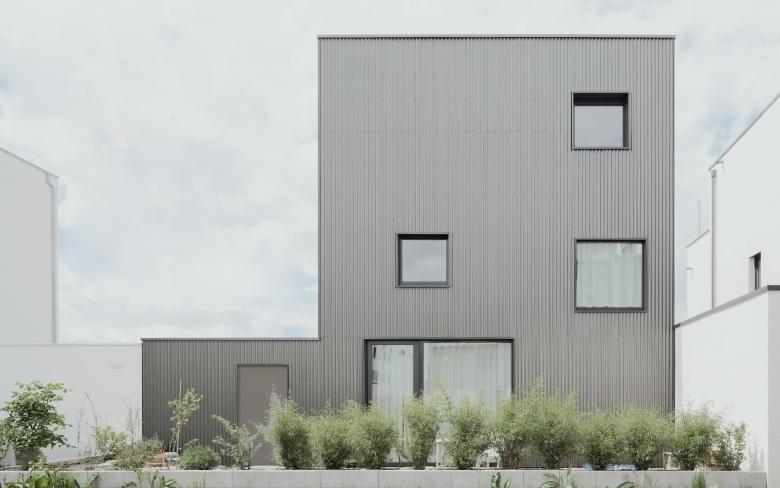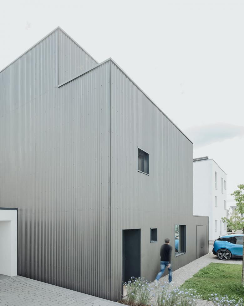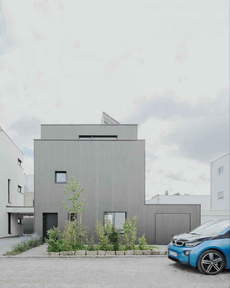 Die dunkle Wellblechfassade stärkt die körperhafte Wirkung des Hauses, das industrielle Material deutet auf den Standort eines ehemaligen Fabrikgeländes hin. Das energetisch optimierte Gebäude mit kontrollierter Lüftung und Wärmerückgewinnung besitzt eine PV-Anlage auf dem Dach. Diese versorgt neben dem Wohnhaus, das Elektrofahrzeug mit ausreichend Strom, um in die Innenstadt zu pendeln...