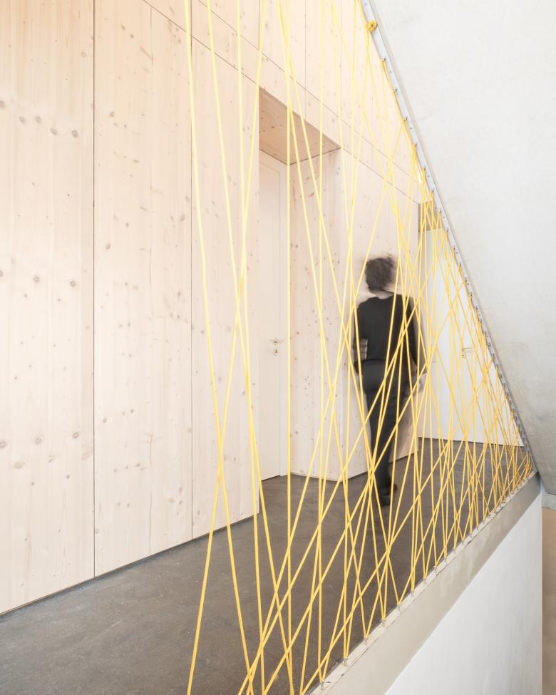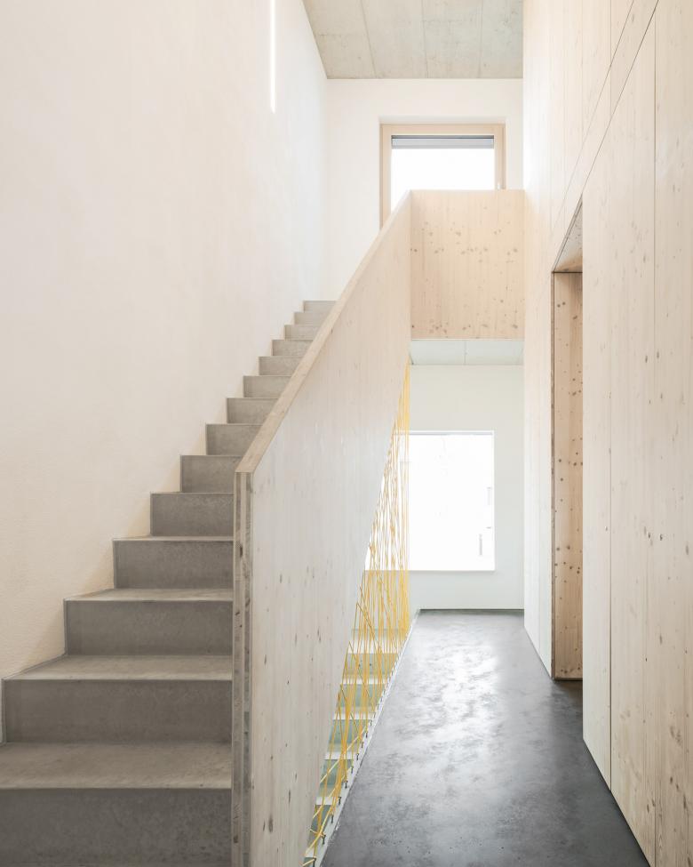 Das Gebäude ist in zwei Hauptzonen gegliedert. Die Funktions-und Erschließungszone mit Treppe, Technikraum, Bad und Abstellraum liegt an der nördlichen Grundstücksgrenze. Die Aufenthaltsräume orientieren sich nach Süden. Der Hauseingang befindet sich auf der Westseite und wird durch einen Einschnitt in der Kubatur artikuliert. Vom Eingangsbereich wird der Blick durch die Treppe nach oben ins erste Obergeschoss gelenkt. Der zweigeschossige Treppenraum vom ersten ins zweite Obergeschoss bildet das lichtdurchflutete Zentrum der Privaträumlichkeiten. Bad, Eltern-und Kinderzimmer sowie Wohnen und Arbeiten im zweiten Obergeschoss werden von hier erschlossen. Die nach Westen orientierte Terrasse erweitert den Wohnbereich und stärkt seine räumliche Qualität.
