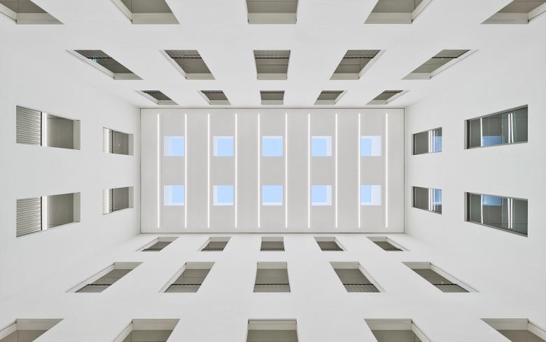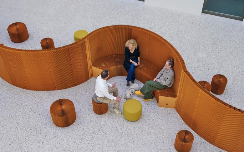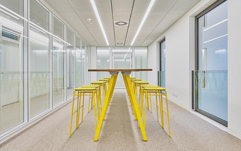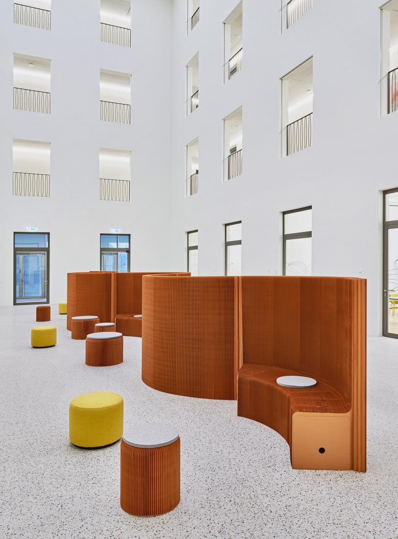 Ein flexibles Möblierungskonzept für das Atrium sieht organisch geformte Sitzmöbel aus gefaltetem Papier vor, die einen Kontrast zum rein rechtwinkligen Raum bilden. Sonnengelb wurde als Leitfarbe für die Möblierung der öffentlichen Bereiche gewählt, als Ergänzung zu den neutral in Weiß gehaltenen Innenräumen.