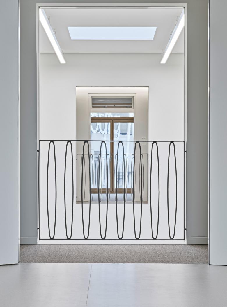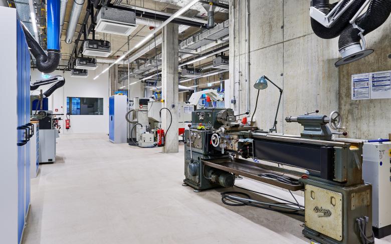 Auf der gegenüberliegenden Seite befinden sich die Werkstätten – das kreative Herzstück des Hauses. Die Obergeschosse sind offen gestaltet - alle Räume haben Bezug zur gemeinsamen Mitte. Ein um das Atrium laufender Gang verbindet die Büros der Wissenschaftler:innen und der Verwaltung mit den Laboren sowie den Besprechungsräumen. Alle Arbeitsräume sind an der Außenfassade angeordnet. Unmittelbar davor, entlang des Atriums bietet sich Raum für Pausen, Besprechungen und informelle Kommunikation.