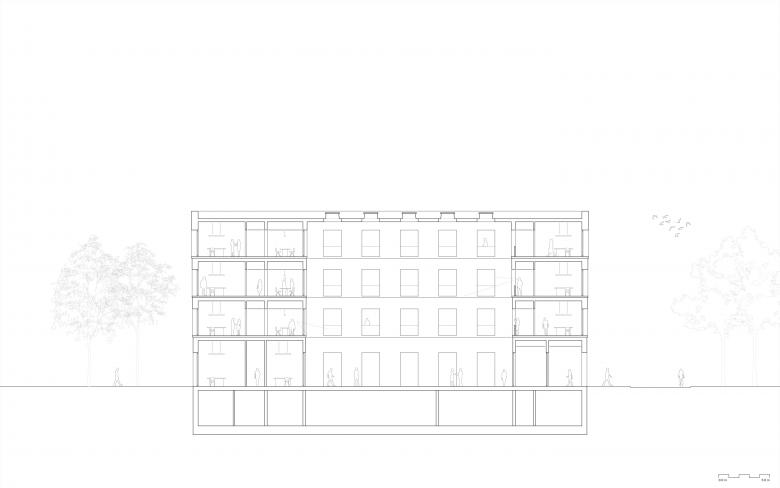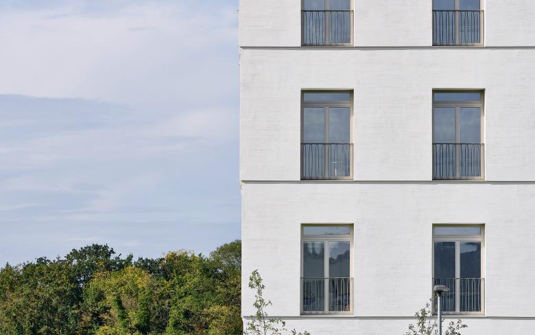 Der Institutsneubau ist als Mauerwerks-Massivbau mit Stahlbetondecken ausgeführt. Die Fensteröffnungen in der gemauerten, tragenden Außenhülle erhalten ein stehendes Format, entsprechend der Tektonik des Bauwerks. Eine horizontale Gliederung erhalten die Fassaden durch den Besenstrichputz sowie die nach oben geschossweise um fünf cm zunehmende Wanddicke, die durch die sinnfällige Integration der Fensterbänke die Fassadennässe gut abtropfen lässt. Um die monolithische Wirkung des Baukörpers zu stärken, sind die Fensterelemente in der Lochfassade nach innen gesetzt. Für die Absturzsicherungen an Außen- und Innenfassaden wurden feingliedrige Elemente aus stehenden Ellipsen entworfen.