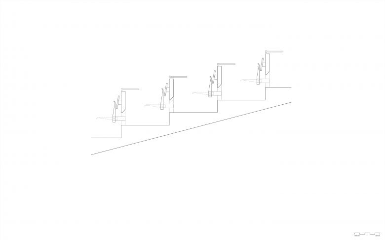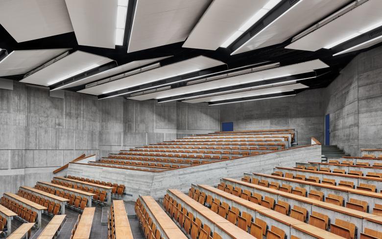 Teile des Hörsaalgestühls wurden erneuert, Hörsaaltische restauriert sowie ein barrierefreier Zugang zu den Hörsaalpodien geschaffen. Die Sanitäranlagen für Besucher/ innen wurden grundlegend überplant und mit zusätzlichen Raumfunktionen wie Wickel- und Putzräumen an die aktuellen Nutzervorgaben angepasst. Die Erneuerung der Echtholz-furnierten Klappsitze mit neuer Mechanik sowie die restauratorische Überarbeitung der Tische mit Teakholzfurnier in Audimax erfolgte in enger Abstimmung und nach Vorgaben der unteren Denkmalschutzbehörde. Bestehende Betonflächen wurden dabei lediglich gereinigt, um die originäre Sichtbetonoptik zu erhalten. Um Referenten eine barrierefreie Zuwegung zu den Hörsaalpodien zu ermöglichen, musste eine rollstuhlgerechte Aufzugsanlage, WCs für die Referenten sowie alle Bereiche des Podienzugangs barrierefrei ertüchtigt werden. Vorhandene Flurabschlüsse wurden im Zuge der Maßnahme brandschutztechnisch ertüchtigt bzw. durch neue Brandschutztüren ersetzt. Hierzu wurde in Zusammenarbeit mit einem Künstler ein Konzept entwickelt, das einerseits eine bessere Orientierung und Auffindbarkeit der Podienzugänge unterstützt und andererseits die unterirdischen Erschließungswege durch die Implementation von künstlerischen Elementen angemessen aufwertet.