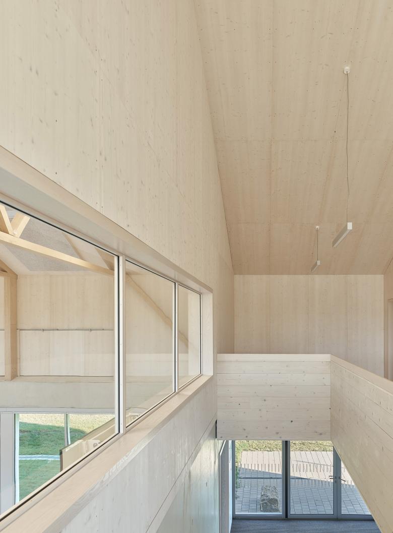 Der Gebäudeentwurf weist eine feingliedrige Struktur im Raster von 2.50 m auf und ist konsequent als konstruktiver Holzbau entwickelt. Die erdberührten und frei bewitterten Bauteile sind dagegen aus Stahlbeton konstruiert. Das filigrane Tragewerk des Hallendachs – 160 Millimeter breite Polonceau-Träger aus Buchenfurnierschichtholz – prägt die Innenraumwirkung maßgeblich.