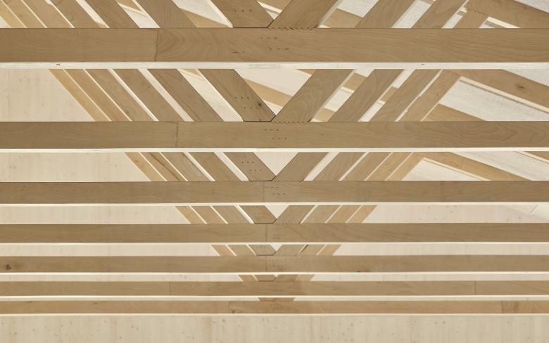 Die Tragelemente sind komplett vorgefertigt und wiederverwendbar. Die reversible Fügung in den Auflagerpunkten zu den ebenfalls aus Buchenfurnierschichtholz bestehenden Stützen unterstreicht den kreislauffähigen Anspruch des Tragwerks.