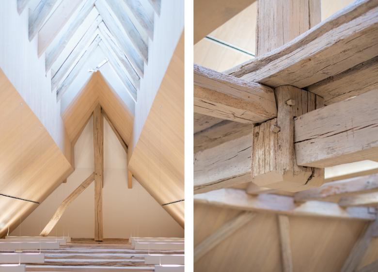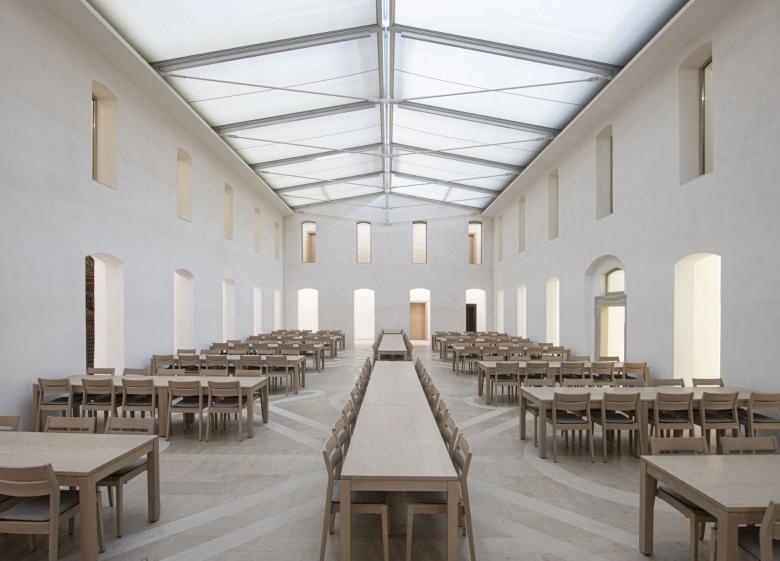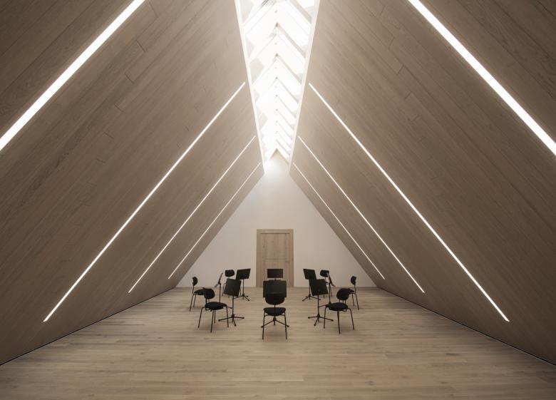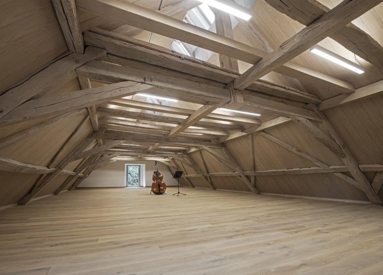 Im Herzen des Klosters der frühere Kreuzgang mit Kreuzgarten. Wir haben die Wände geöffnet und ein gläsernes Dach gespannt. Ein großer Saal zum Speisen, Tagen, Tanzen, Musizieren oder Kommunizieren – ein pulsierender Ort der Begegnung, aber auch ein multifunktionaler, akustisch optimierter und verschattbarer zentraler Raum für Konzerte, Konferenzen oder ein Fest. Überall ist Leben und Musik. Unser Reminiszenz an die Geschichte des Gebäudes: Die Symbole »Glaube, Hoffnung und Liebe« als Pflanzenornamente im Steinboden erinnern an die Buchsbäume des Kreuzgartens. Diese haben mit den Mönchen das Kloster verlassen. Ein Saal im Freien, mehr Außen- als Innenraum – mit Einblicken, Durchblicken, Ausblicken. Wir übertragen diesen Kreuzganggedanken auch in das erste Obergeschoss. Der Blick geht bis in den Himmel. Ein Spiel aus Licht und Schatten – bei Tag und bei Nacht. So wie es ist, war es noch nie. Aber es fühlt sich an, als ob es schon immer so gewesen ist. Außenherum und darüber die Übungsräume und das Tonstudio. Kleine und große. Zwei besondere im Dach. Diese führen einen einzigartigen Dialog. Der eine macht den historischen Dachstuhl erlebbar, der andere ist sein zeitgemäßer Gegenspieler. Im Südflügel befinden sich, als Zonen der Ruhe und Einkehr, Übernachtungszimmer in den historischen Klosterzellen.