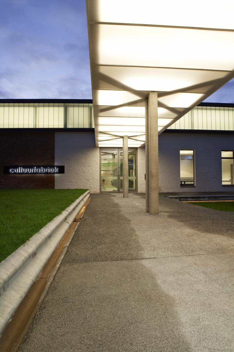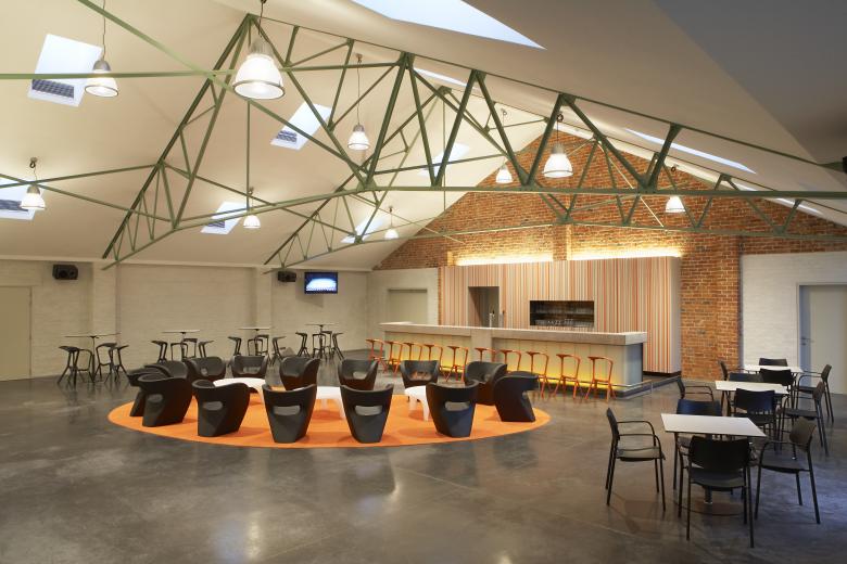 The transformation of this historic paper factory in Damme into a vibrant cultural center showcases a harmonious blend of industrial aesthetics and inviting elements.
