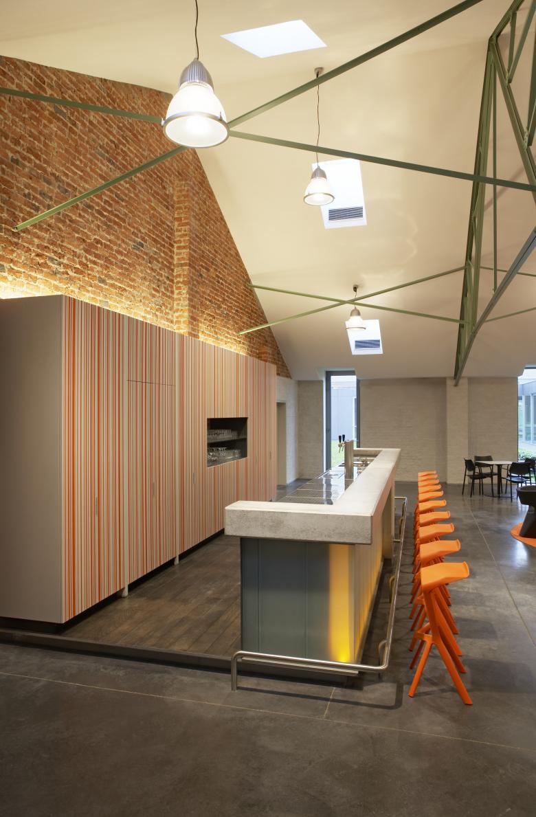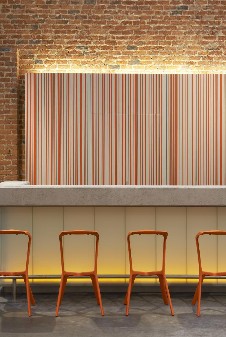 The design honors the building’s rich heritage while integrating warm materials that create a welcoming atmosphere. The interior is carefully composed with custom cabinetry that functions as barcodes in various colors, warm carpets, and an interplay of red brick that contrasts with concrete and steel. A central patio brings light and air into the space, contributing to a pleasant and inspiring experience.
